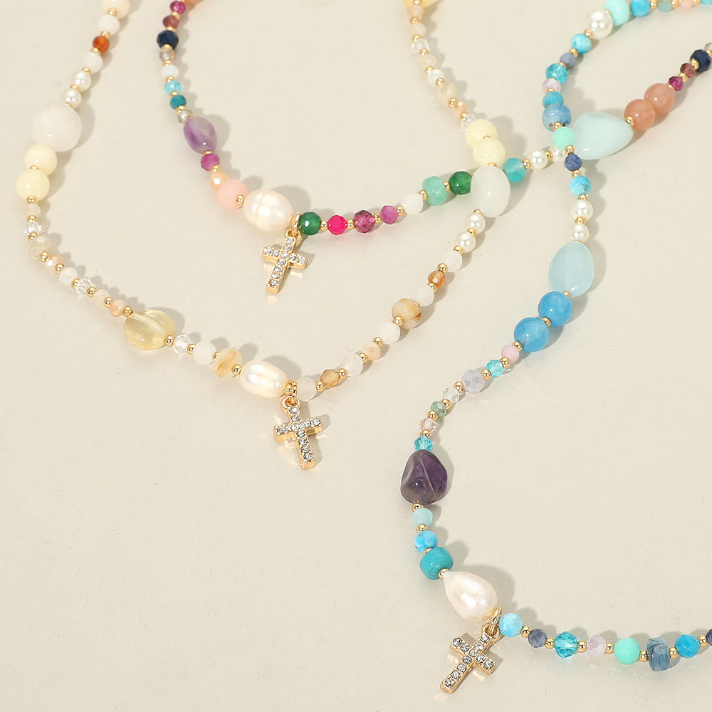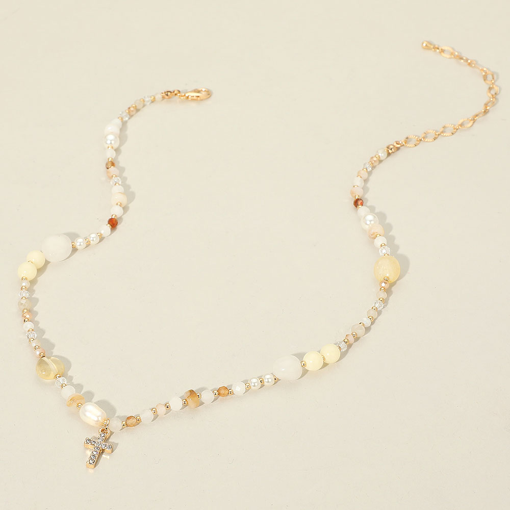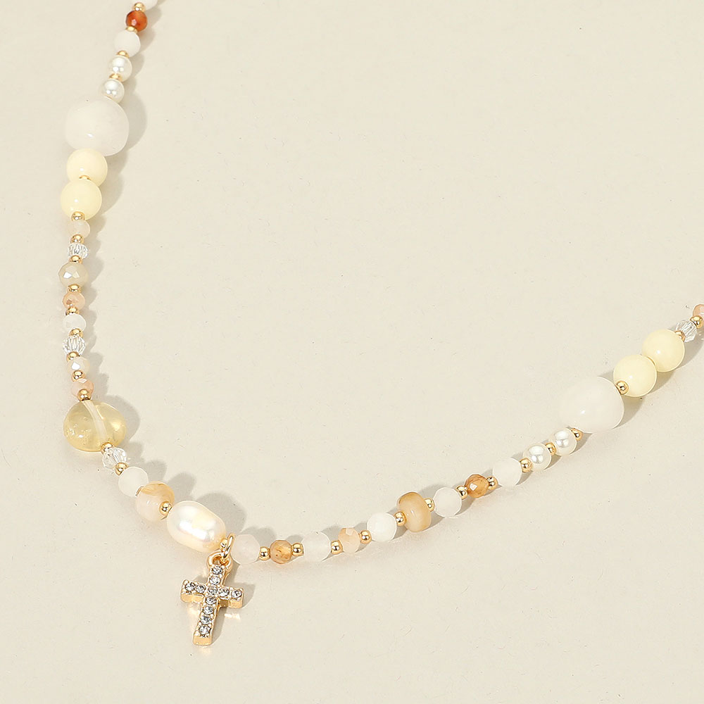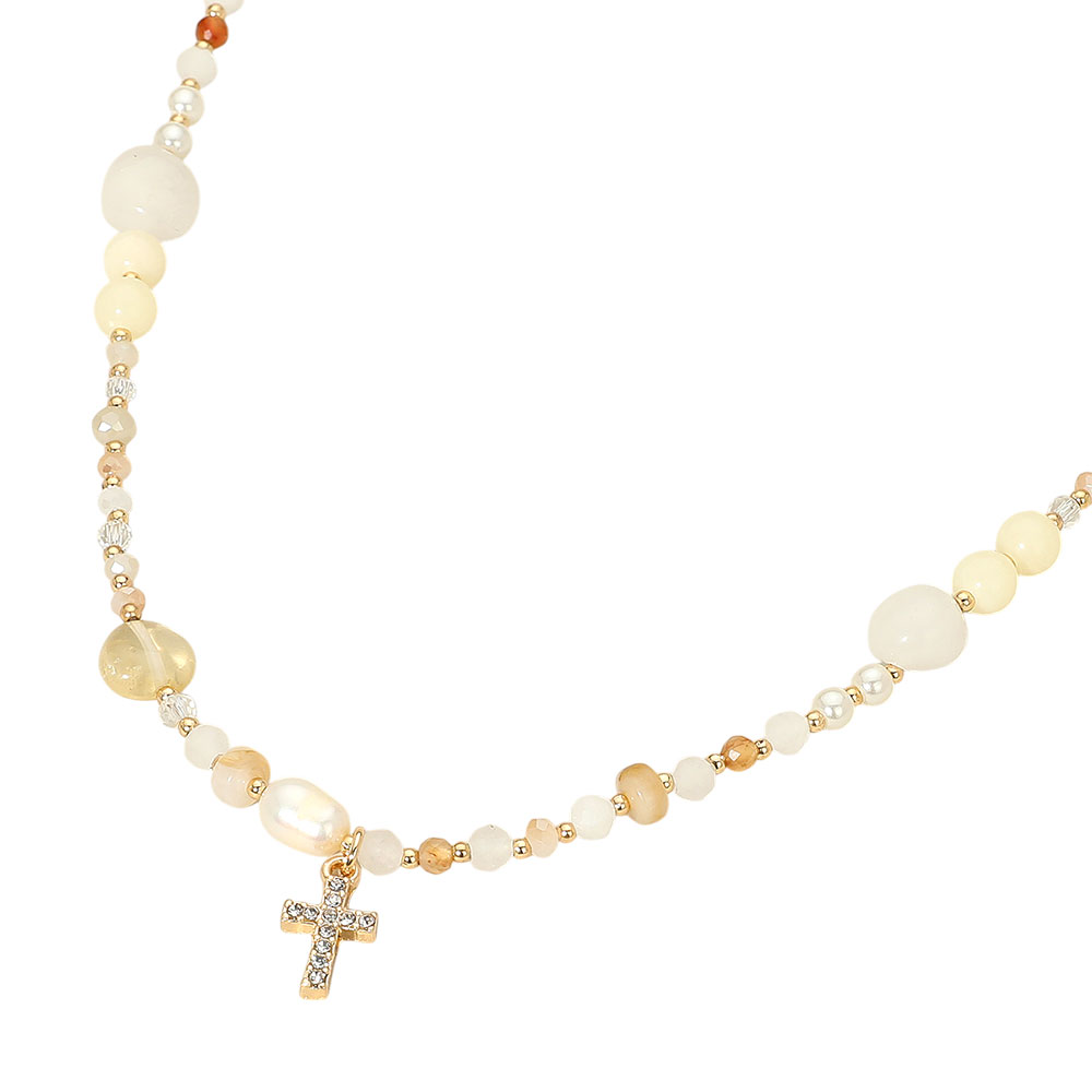Details • Necklace Size : 16" + 3.5" L • Decor Size : 0.7" L • Graceful necklace featuring mixed beads and a sparkling cross charm. A refined piece that blends elegance with a subtle faith-inspired touch for everyday wear or special occasions. • Lead and Nickel Compliant