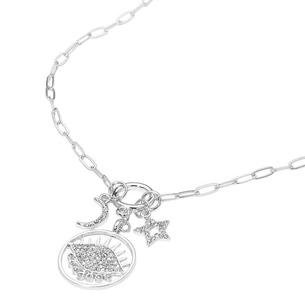 Details • Necklace Size : 17" + 2.5" L • Decor Size : 1.75" L • Add a touch of celestial elegance with this charm necklace featuring moon, star, and eye pendants adorned with sparkling stones. Perfect for layering or wearing solo, this piece blends modern style with symbolic beauty, making it ideal for both everyday wear and special occasions. • Lead and Nickel Compliant