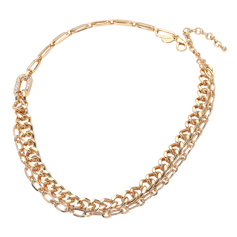 • Stylish statement necklace combining bold curb and elongated link chains for a modern layered effect. Features an asymmetrical design with a touch of sparkle, perfect for elevating any outfit with contemporary sophistication and versatile everyday appeal.