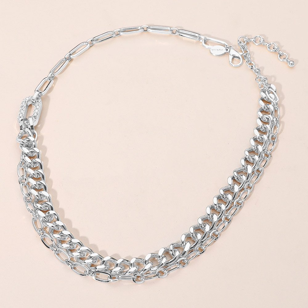 • Stylish statement necklace combining bold curb and elongated link chains for a modern layered effect. Features an asymmetrical design with a touch of sparkle, perfect for elevating any outfit with contemporary sophistication and versatile everyday appeal.
