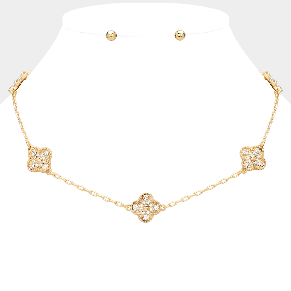 White Gold Dipped CZ Embellished Triple Quatrefoil Pendant Necklace