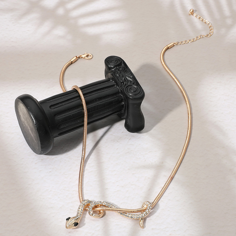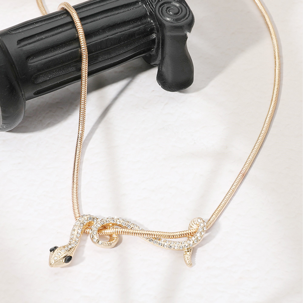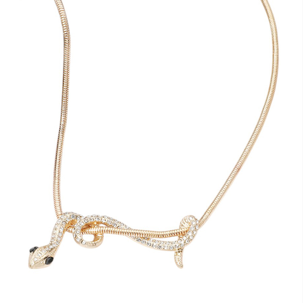 Details • Necklace Size : 18.5" + 3.25" L • Decor Size : 1.7" L • This snake pendant necklace features a sleek chain with a serpent design, highlighted by sparkling crystal accents and dark eye details. A striking statement piece that combines edgy style with elegance, perfect for enhancing both casual and evening outfits with a bold and unique touch. • Lead and Nickel Compliant
