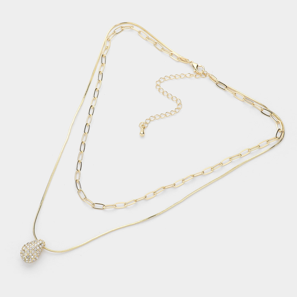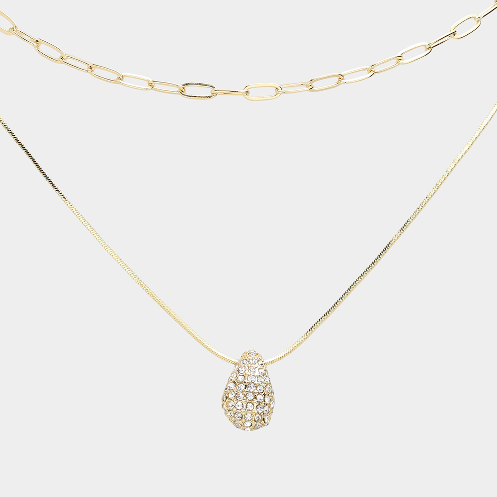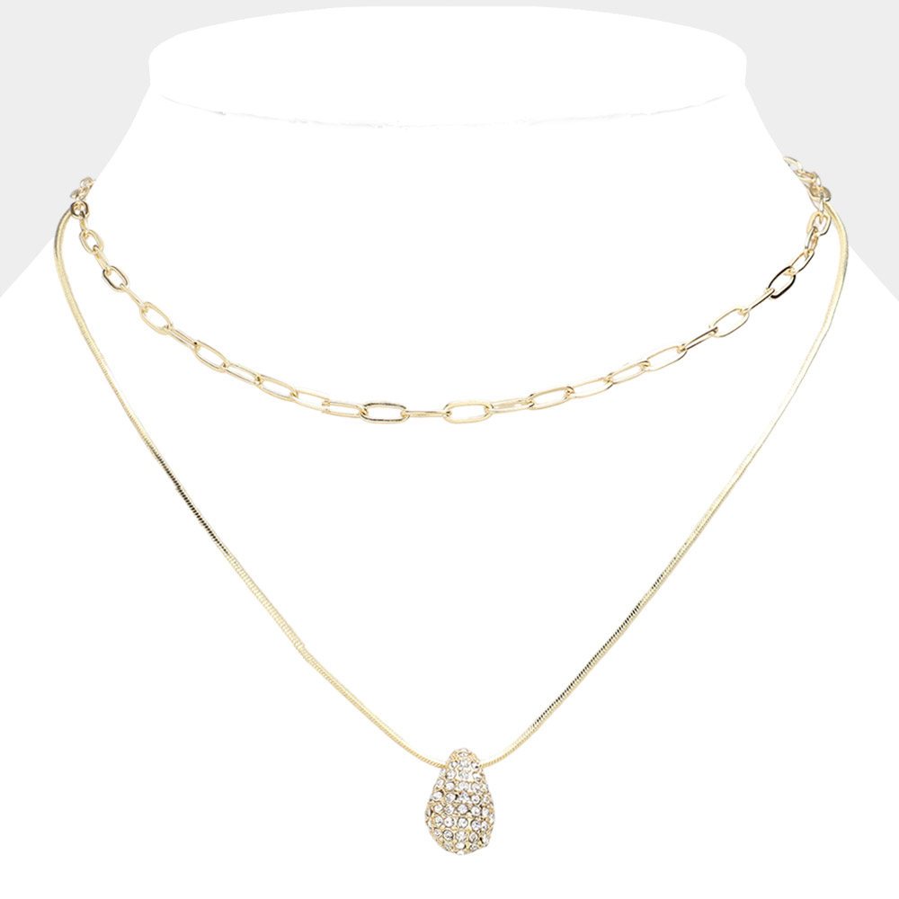 Stone Paved Teardrop Pendant Double Layered Necklace