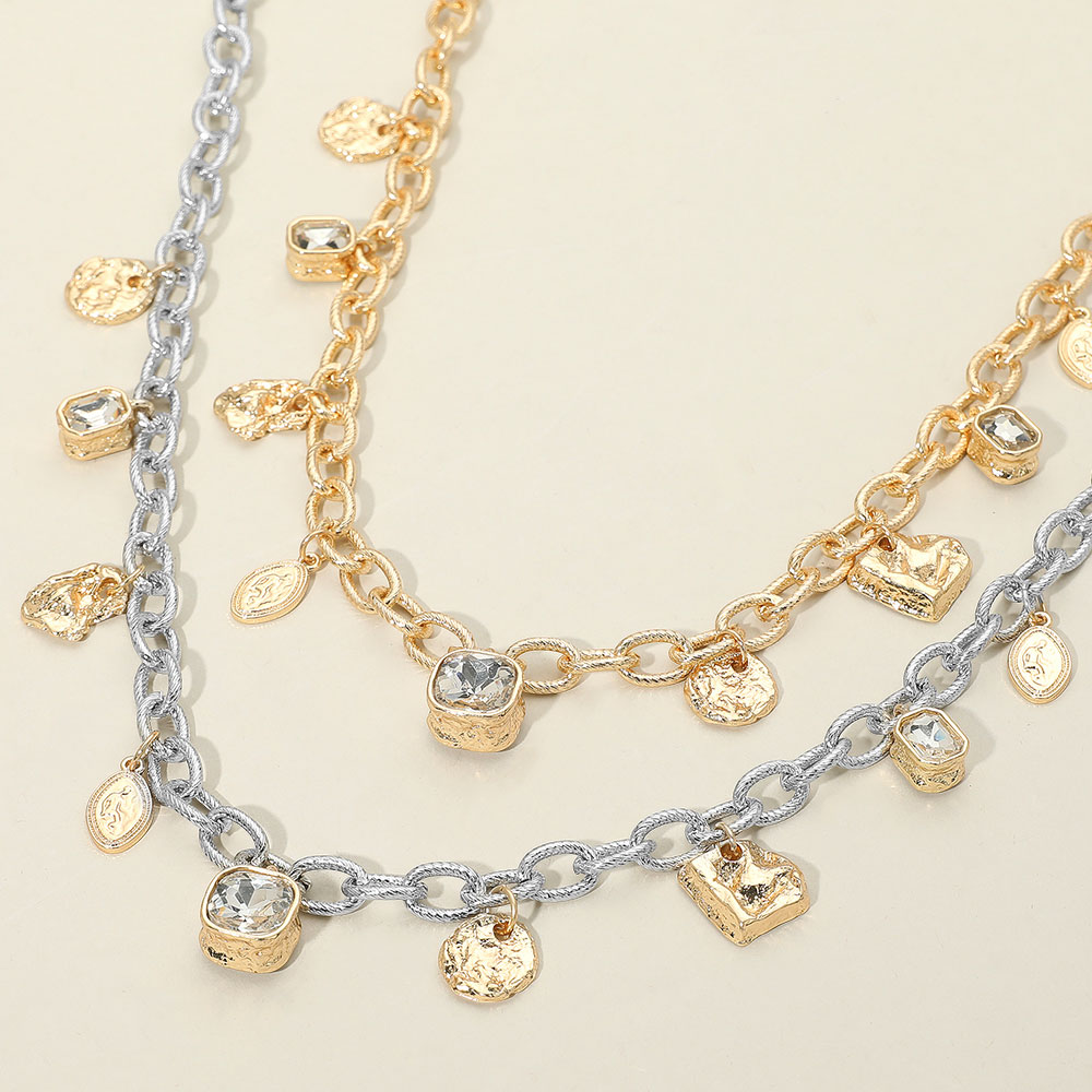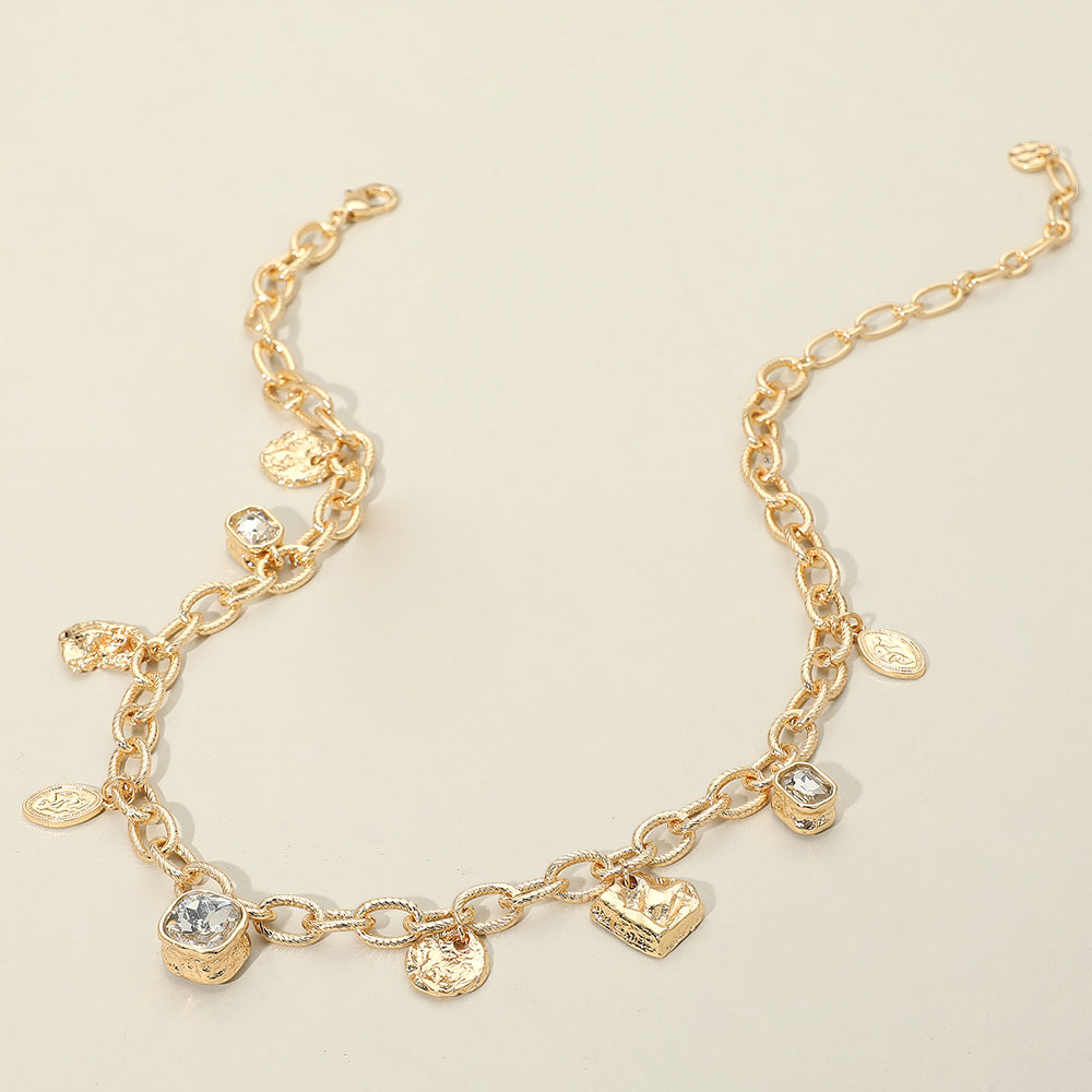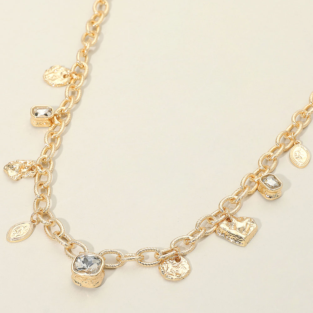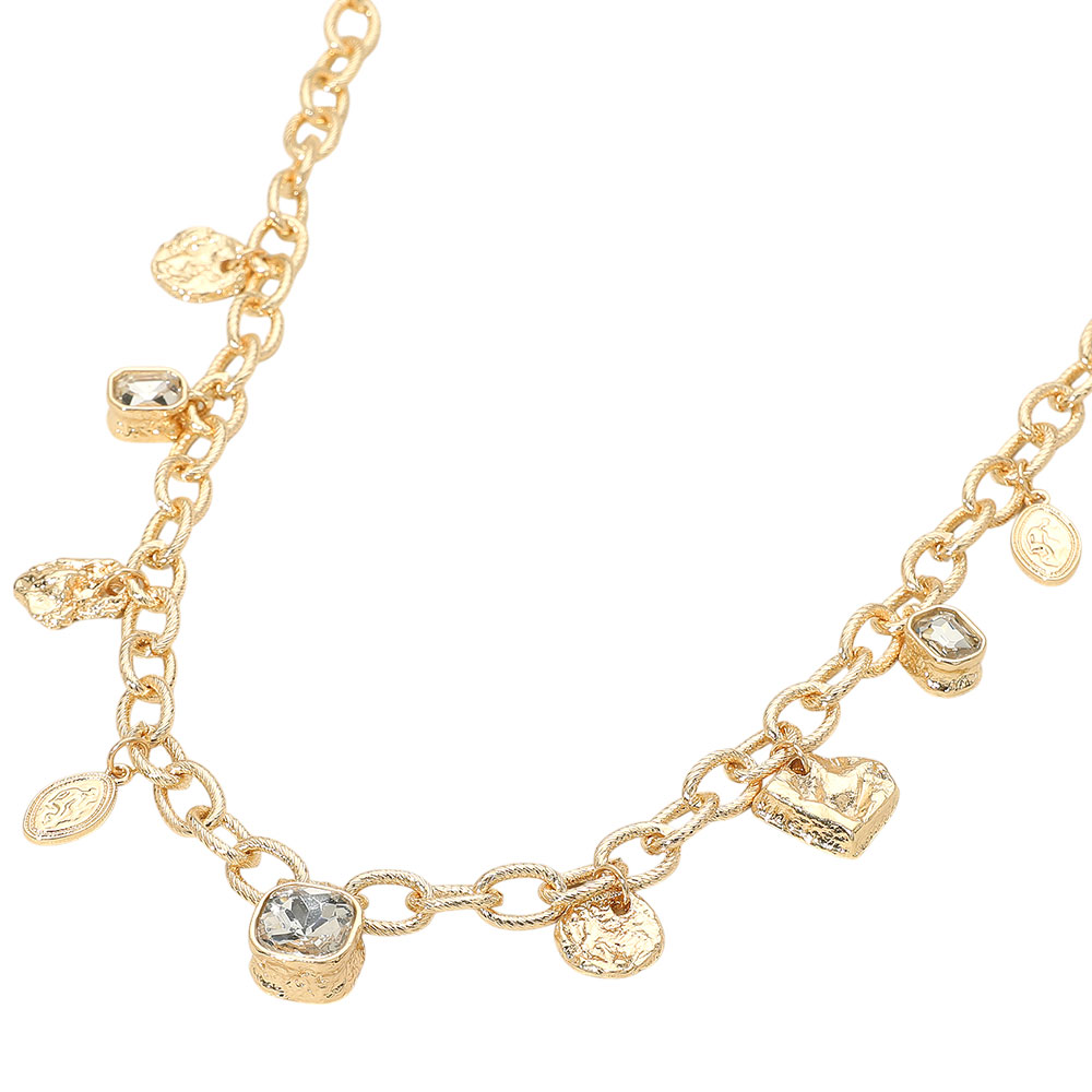 Details • Necklace Size : 16.5" + 3.75" L • Decor Size : 0.75" L • Make a bold statement with this chunky gold chain necklace, adorned with an eclectic mix of textured charms and sparkling crystal accents. Featuring a vintage-inspired design with a modern twist, this standout piece adds instant glam to any outfit—perfect for trendy, fashion-forward looks. • Lead and Nickel Compliant