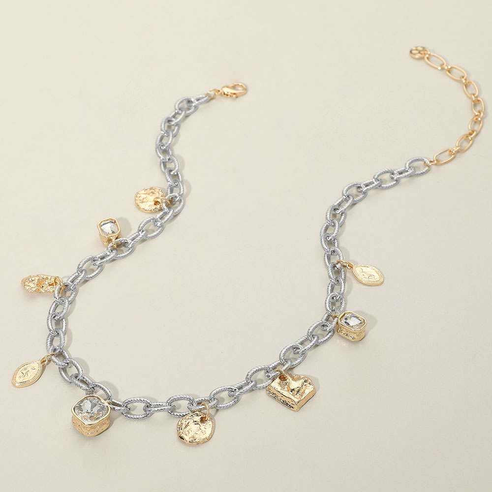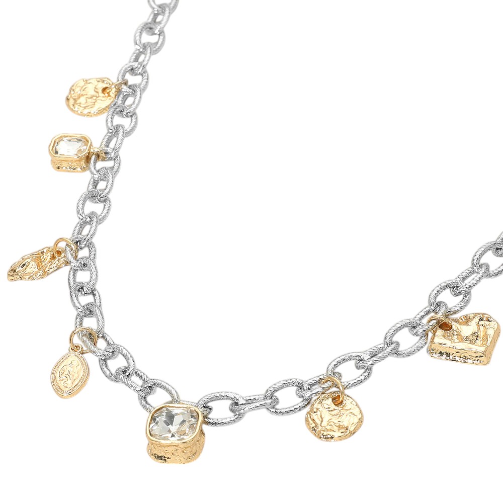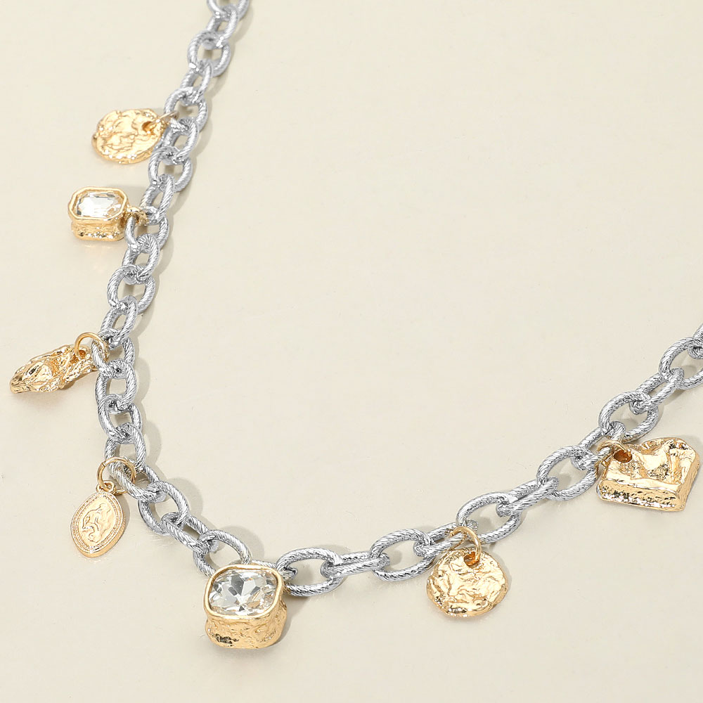 Details • Necklace Size : 16.5" + 3.75" L • Decor Size : 0.75" L • Make a bold statement with this chunky gold chain necklace, adorned with an eclectic mix of textured charms and sparkling crystal accents. Featuring a vintage-inspired design with a modern twist, this standout piece adds instant glam to any outfit—perfect for trendy, fashion-forward looks. • Lead and Nickel Compliant