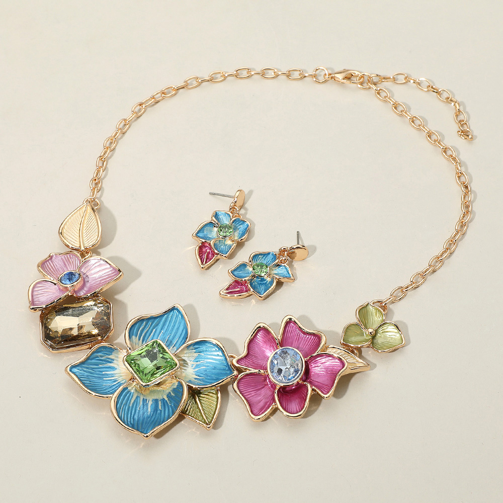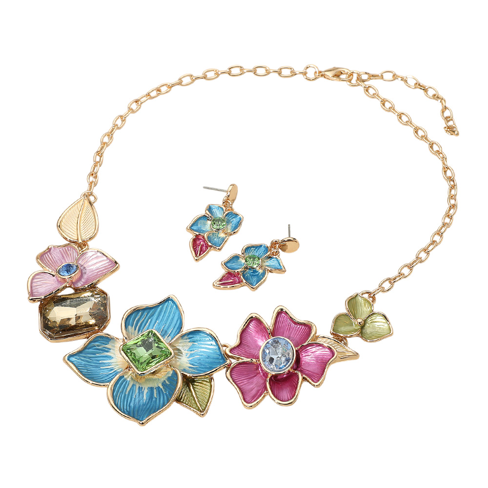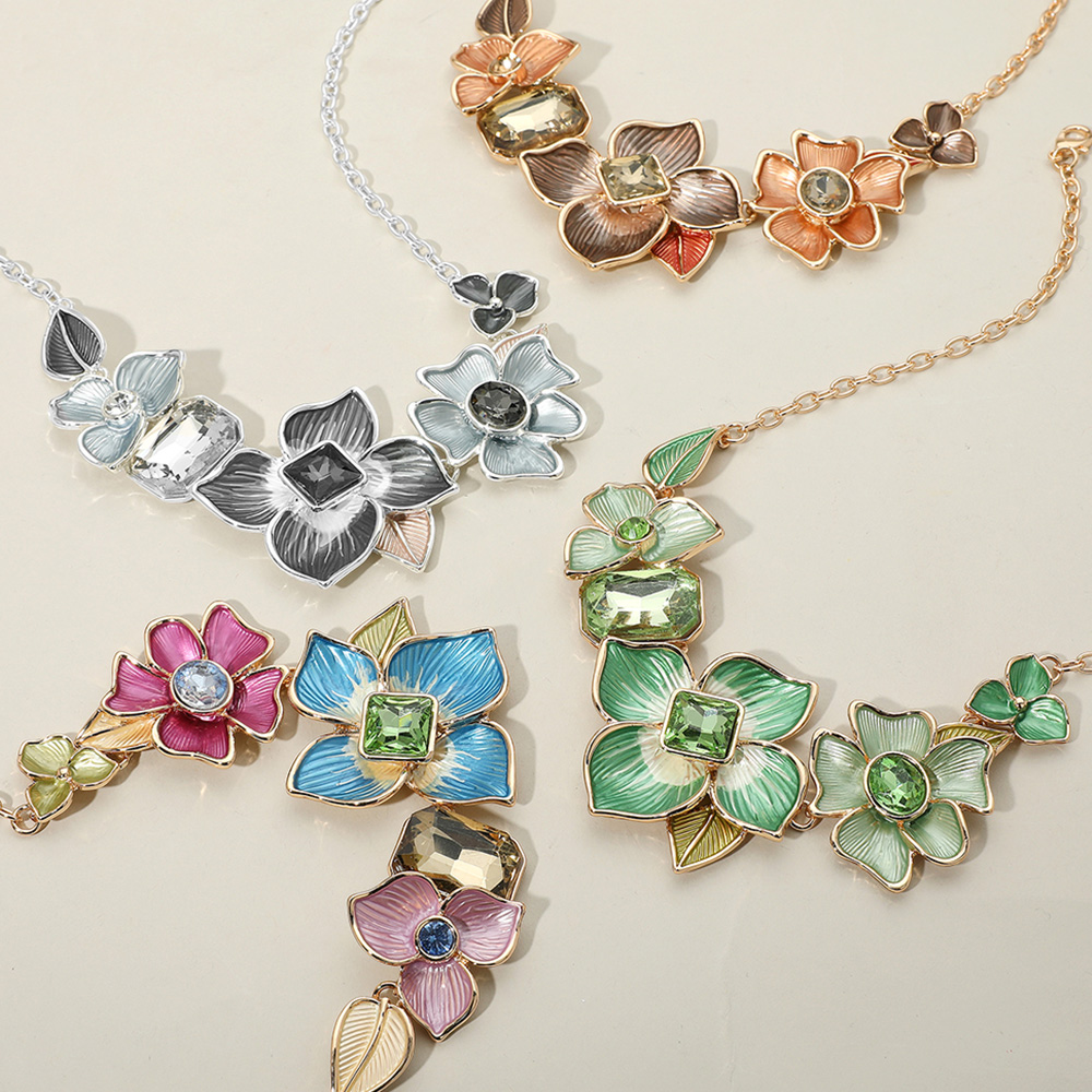 Details • Necklace Size : 17" + 2.5" L • Decor Size : 2.1" L • Earrings Size : 1.5" L • Chic floral statement necklace with matching earrings, designed with green enamel petals and crystal accents. Ideal for adding elegance to special occasions or enhancing your everyday look with floral charm. • Lead and Nickel Compliant