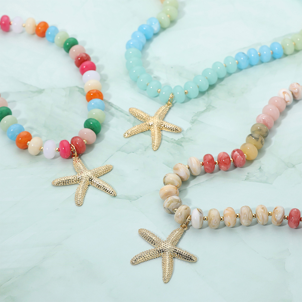 • Playful beaded necklace featuring colorful round beads accented with a textured starfish pendant. A vibrant and stylish accessory perfect for beach outings, summer looks, or adding a fun coastal vibe to everyday wear.
