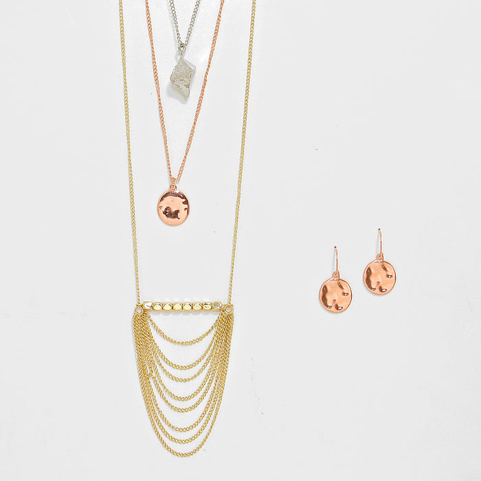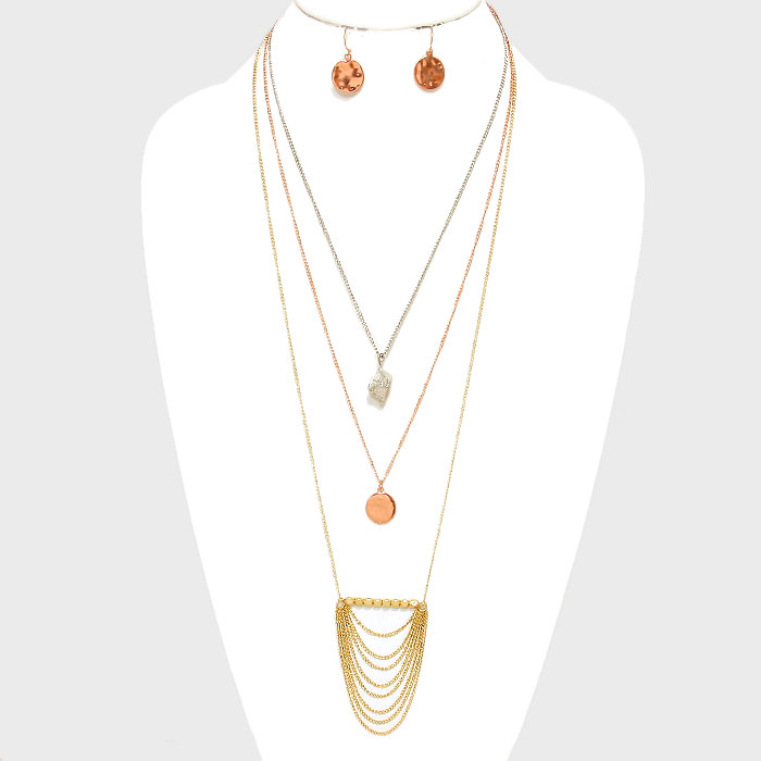 Triple Layer Hammered Metal Disc & Draped Chain Pendant Necklace