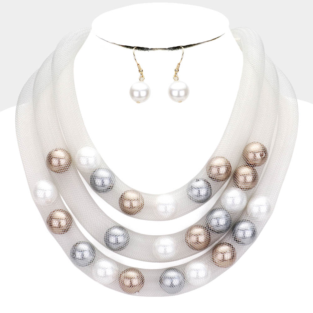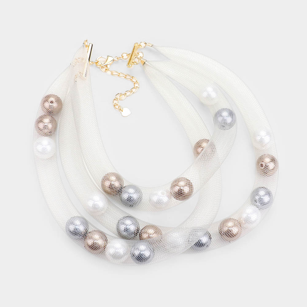 Pearl Accented Triple Layered Mesh Bib Necklace
