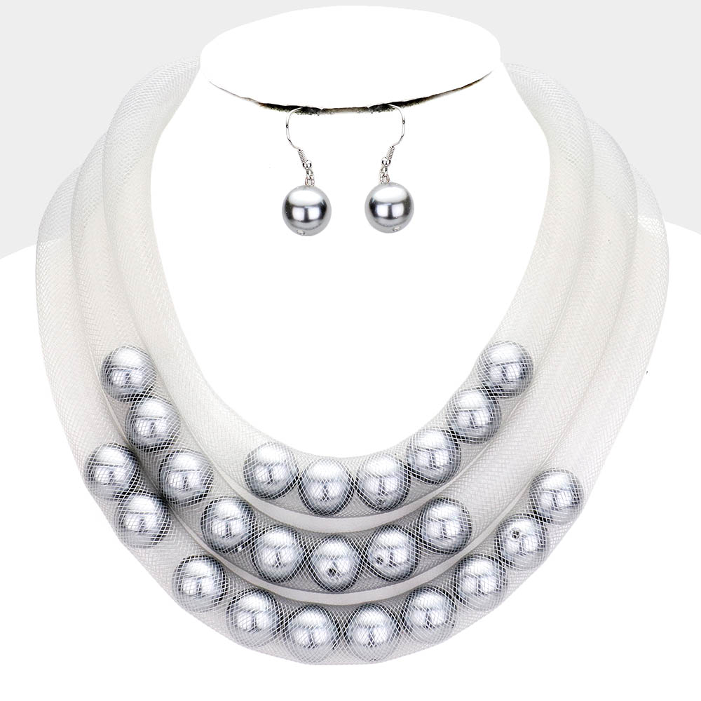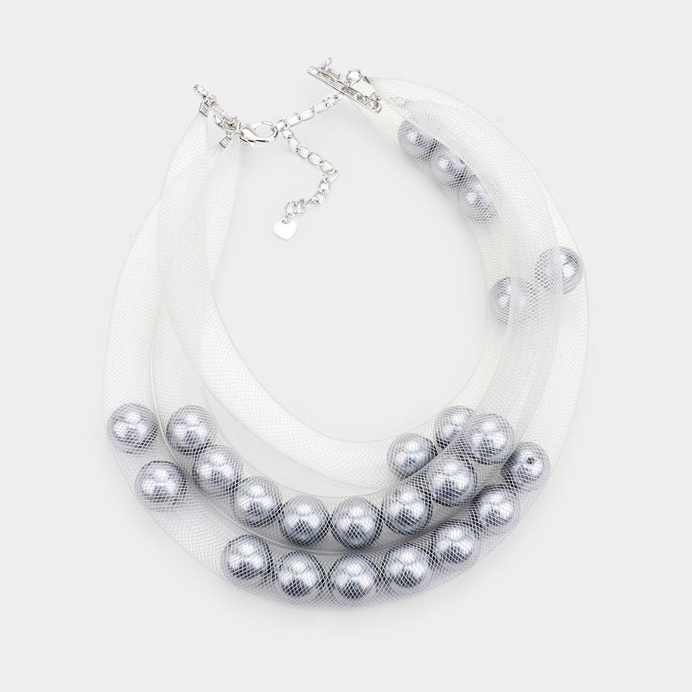Pearl Accented Triple Layered Mesh Bib Necklace