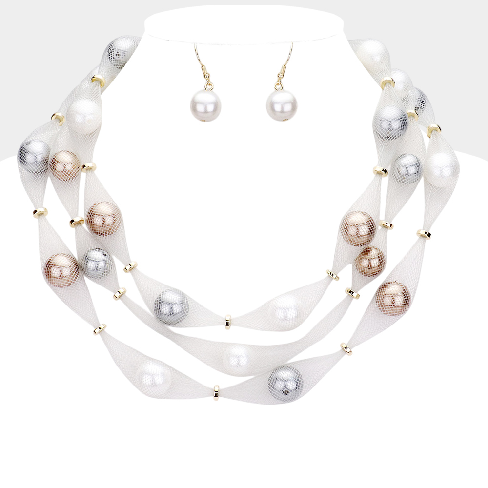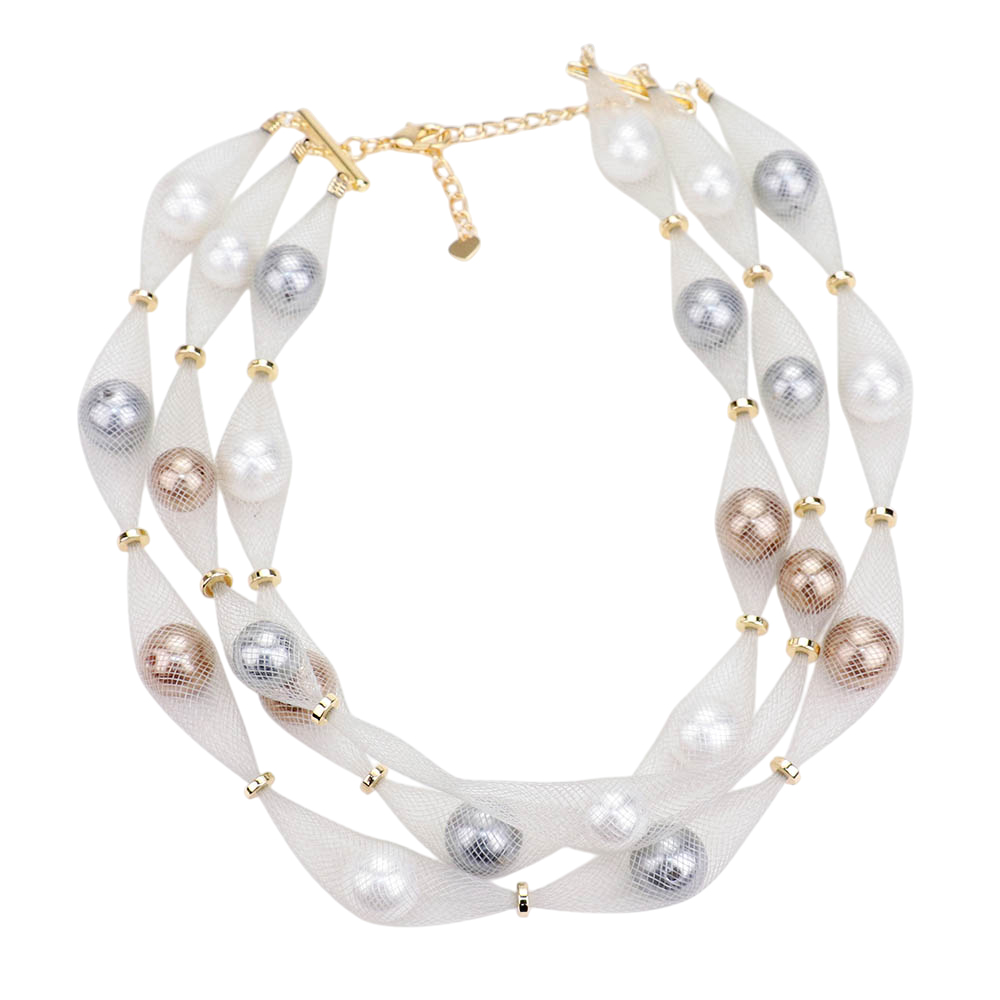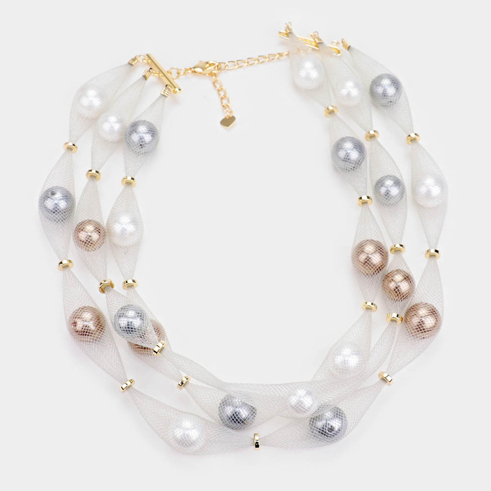 Pearl Accented Triple Layered Mesh Bib Necklace