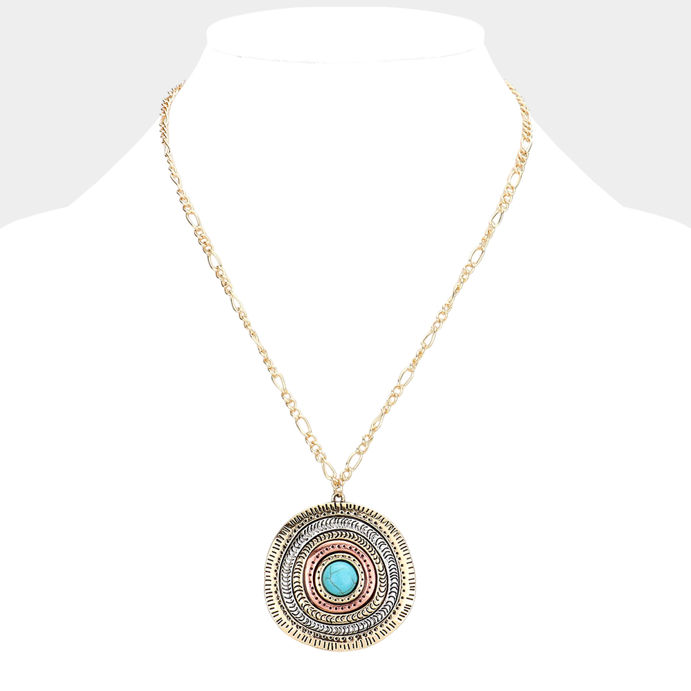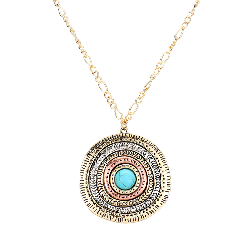 Turquoise Centered Irregular Metal Round Pendant Necklace