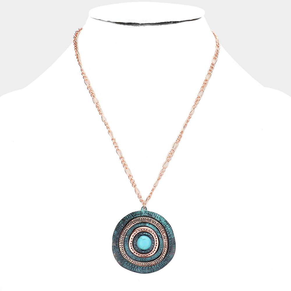 Turquoise Centered Irregular Metal Round Pendant Necklace
