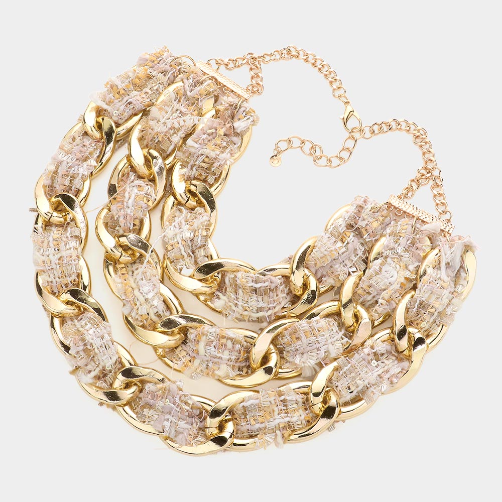 Tweed Fabric Metal Chain Link Triple Layered Bib Necklace