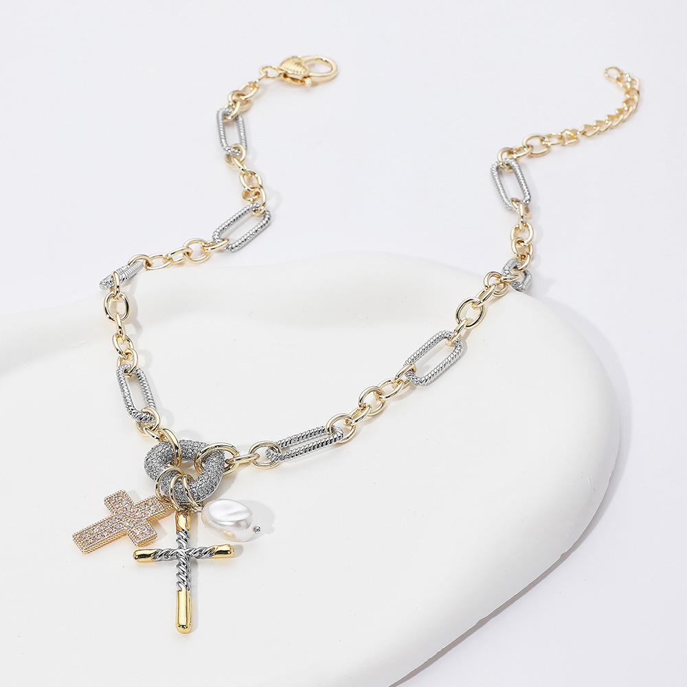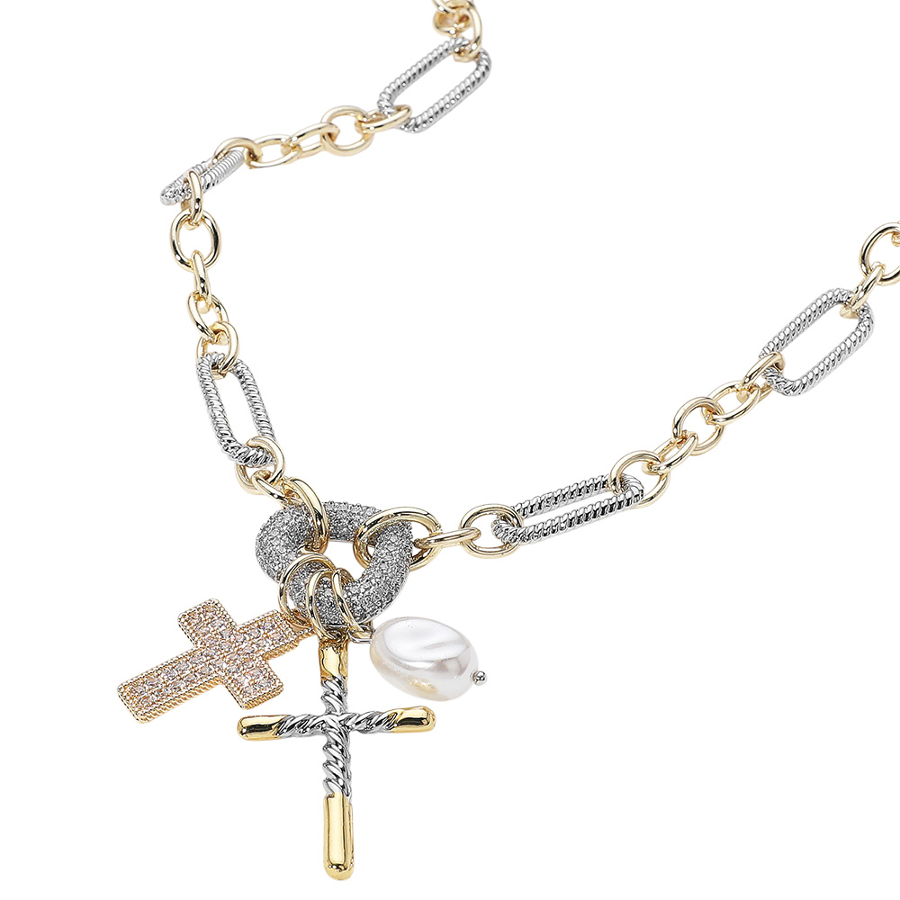 • Statement necklace featuring dual-tone textured links, layered cross pendants, and a pearl charm. A bold blend of classic and contemporary style.