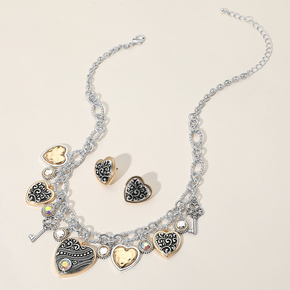 Two Tone Antique Metal Heart Clover Key Stone Charm Station Necklace