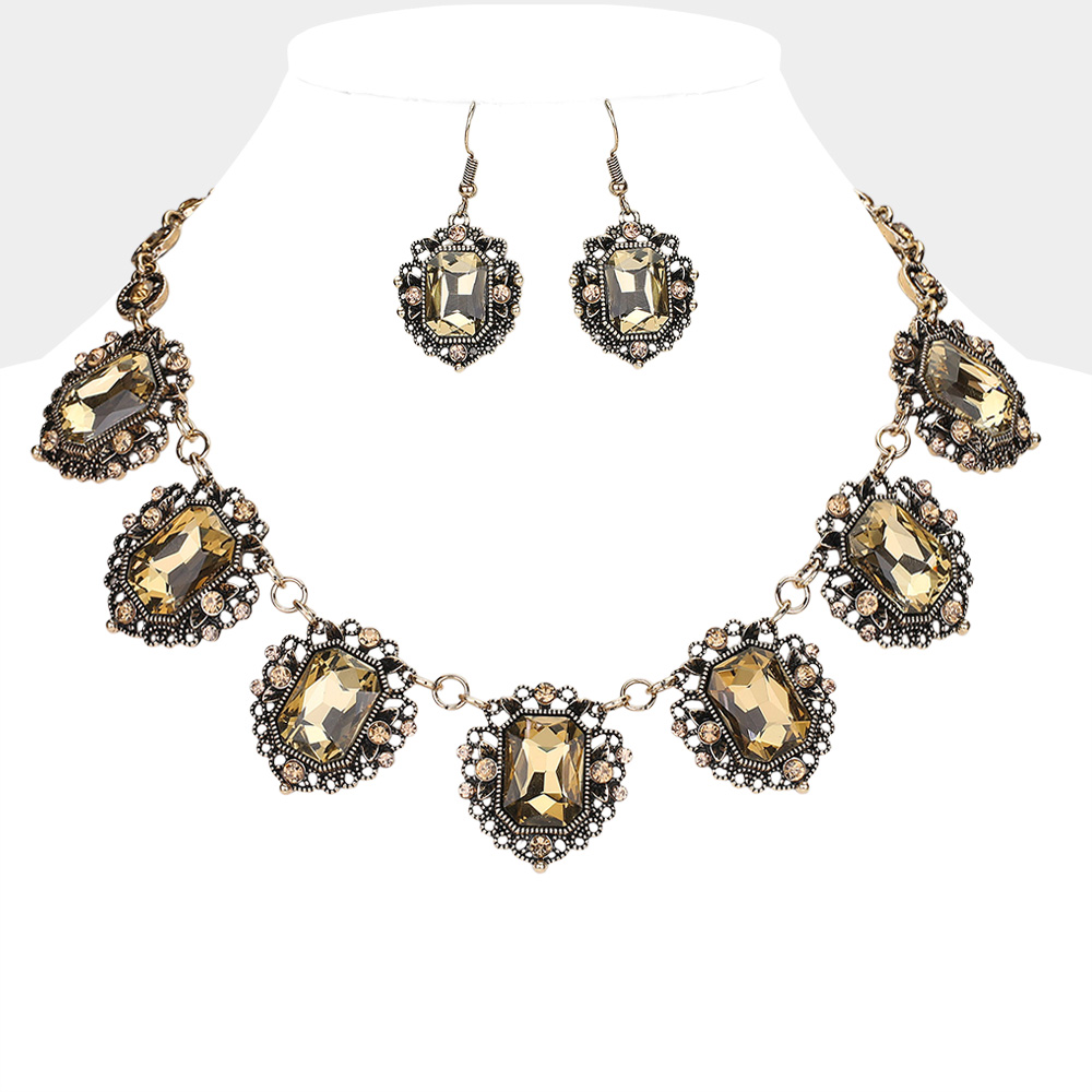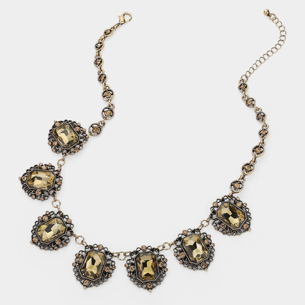 Victorian Style Rectangle Stone Cluster Link Station Necklace