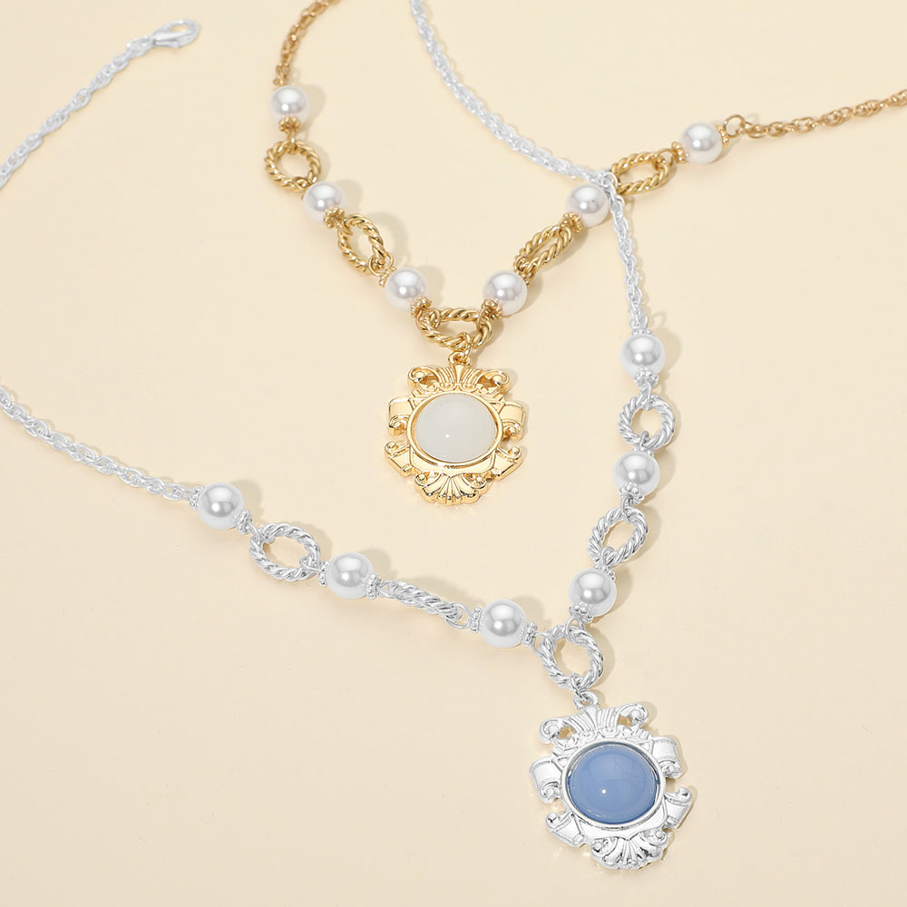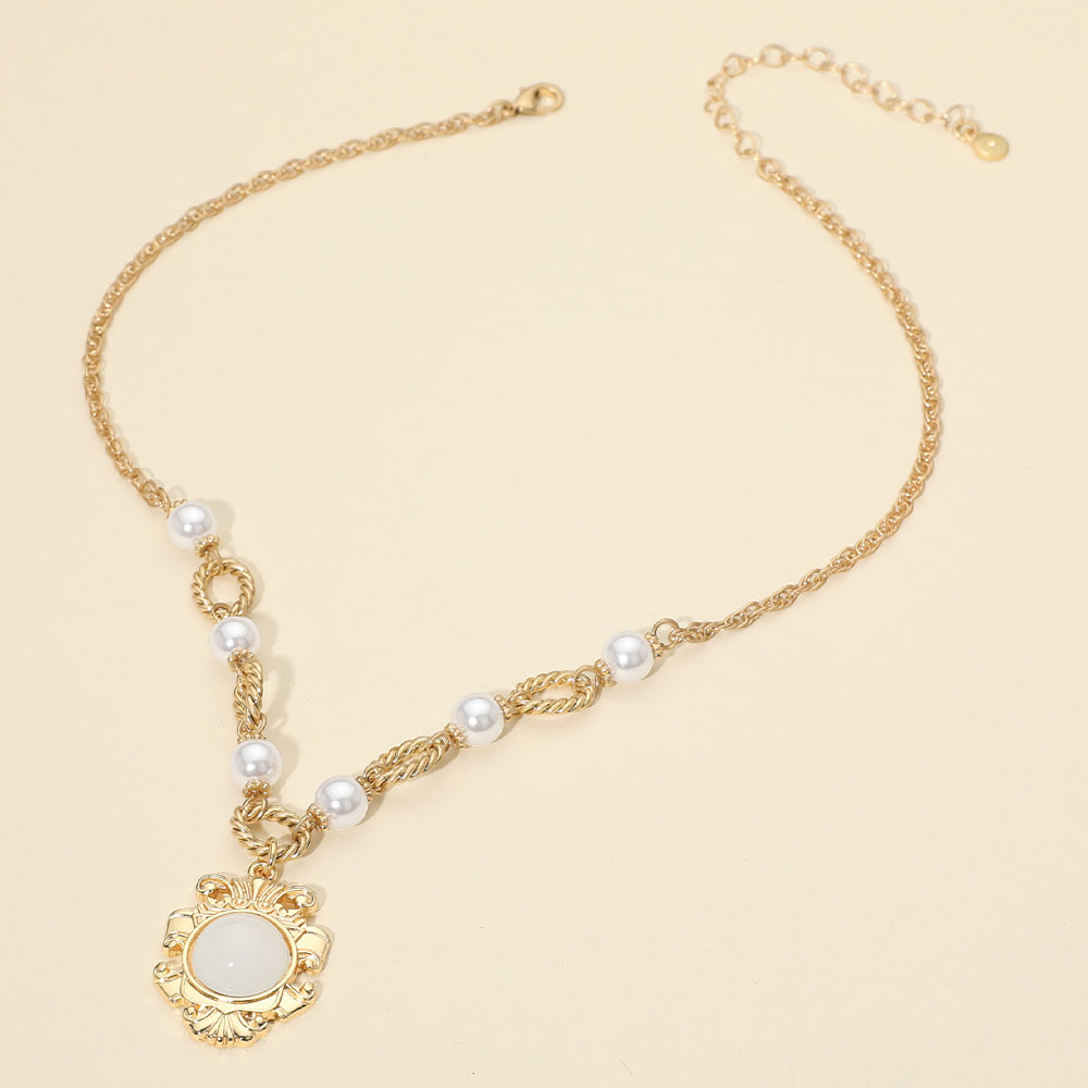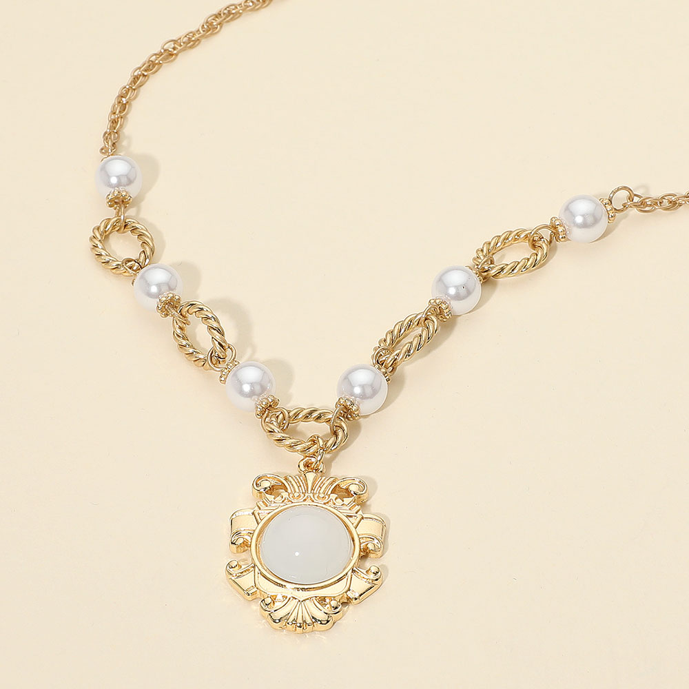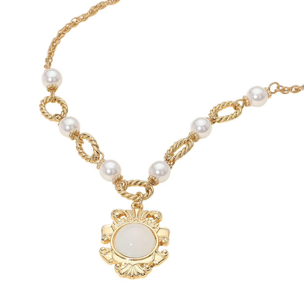Details • Necklace Size : 17.5" + 3.5" L • Decor Size : 1.75" L • This elegant necklace showcases a vintage-inspired medallion pendant, accented with lustrous pearls and twisted links for a refined look. Perfect for formal events or adding a sophisticated charm to any outfit. • Lead and Nickel Compliant