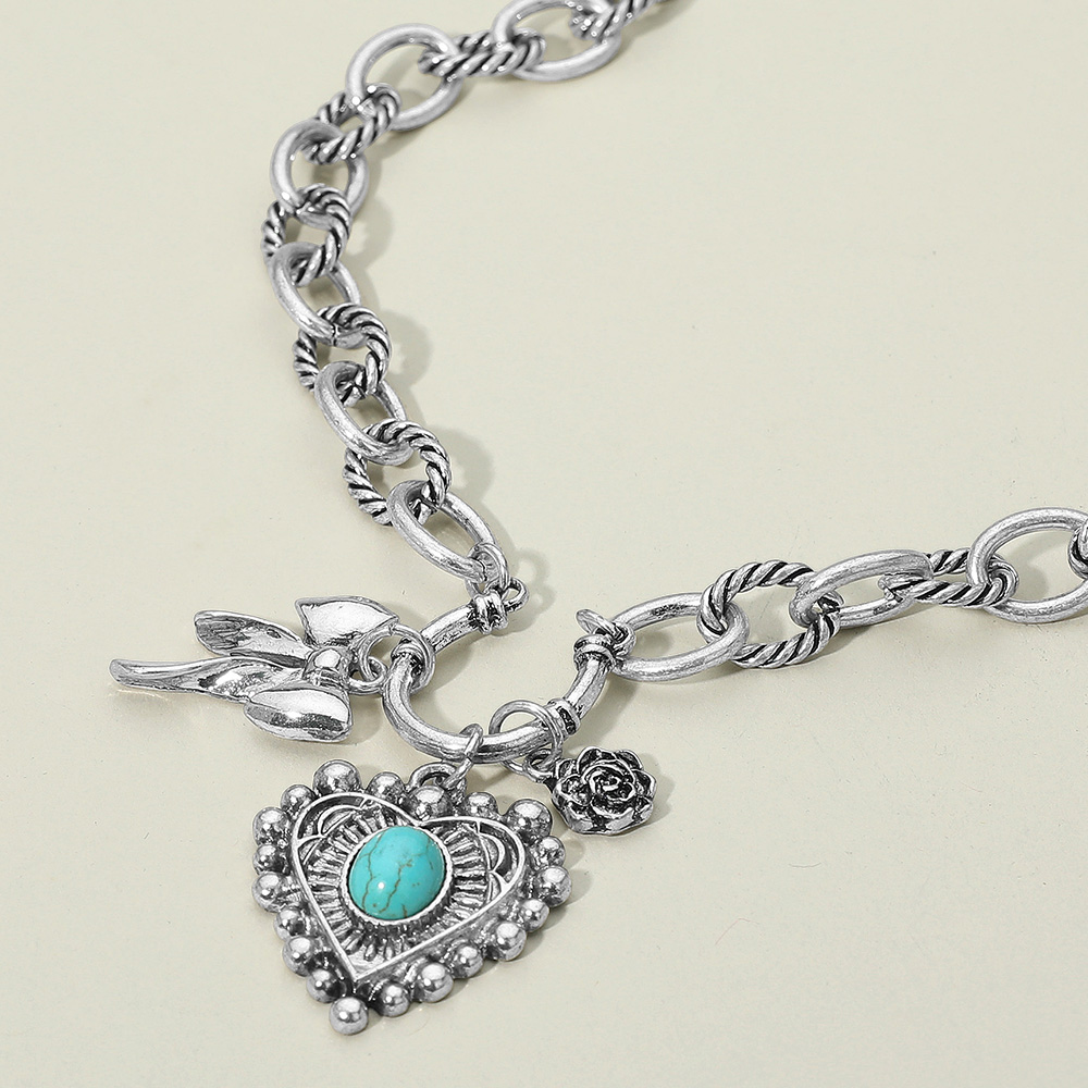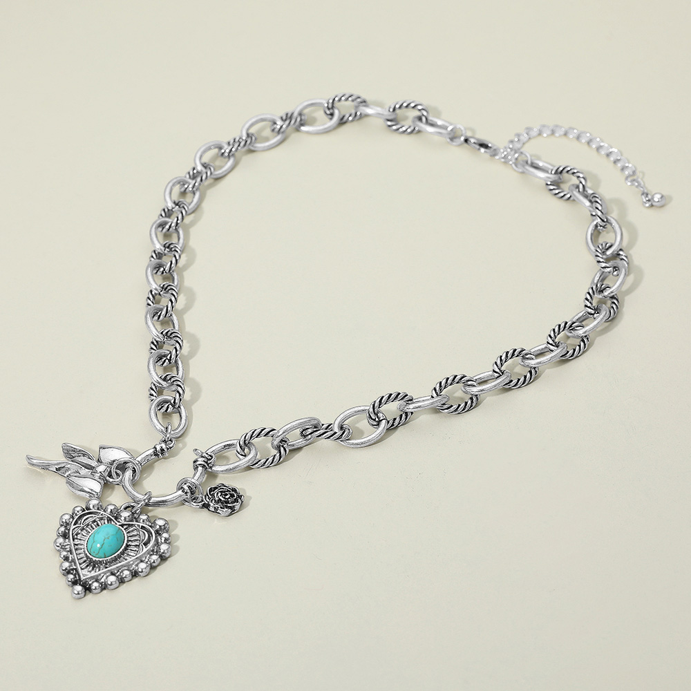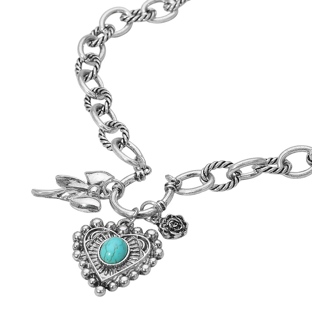 Details • Necklace Size : 16.5" + 3.25" L • Decor Size : 2.25" L • Charming chain necklace with a vintage-inspired design featuring a heart pendant, rose accent, and bow detail. A unique piece blending romance and artistry, perfect for layering or wearing as a statement accessory. • Lead and Nickel Compliant