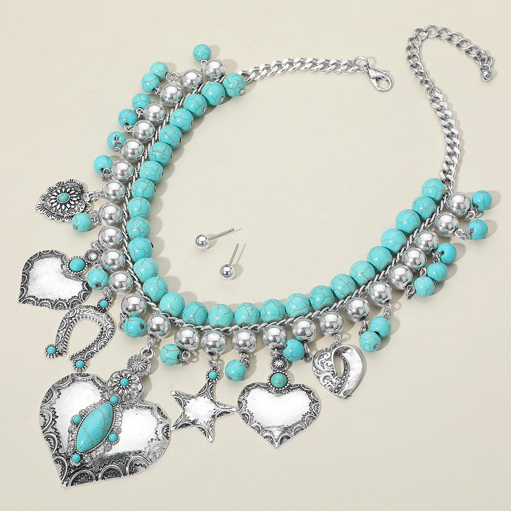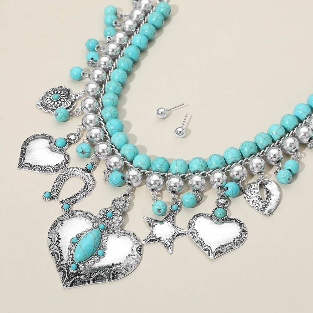 Details • Necklace Size : 16.5" + 3.5" L • Decor Size : 3.5" L • Earrings Size : 0.2" L • Bold statement necklace featuring a mix of heart, star, and beaded charms with layered strands and matching stud earrings. Perfect for making an impression at festivals, events, or styled with everyday fashion. • Lead and Nickel Compliant