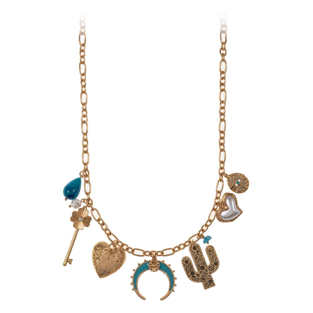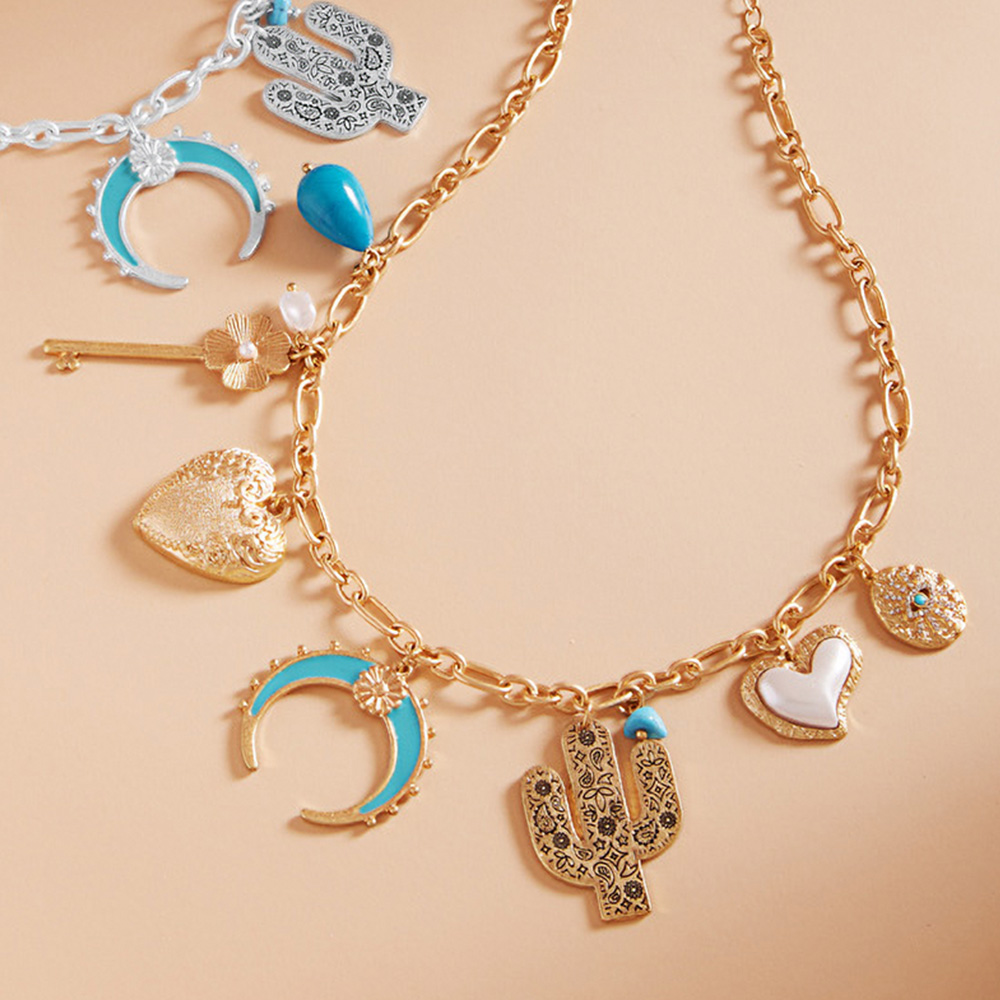 Western Cactus Pearl Heart Metal Flower Key Crescent Charm Station Necklace