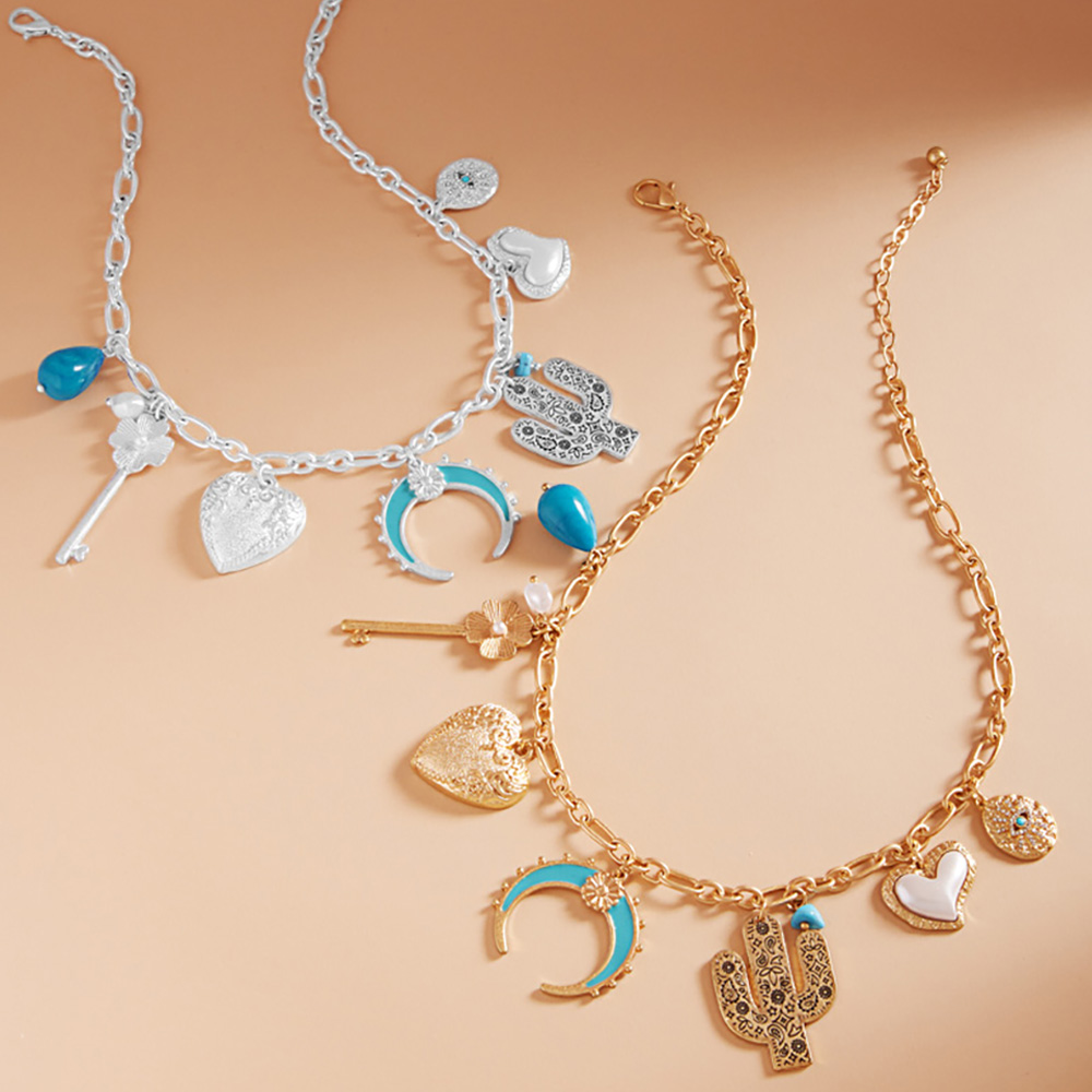Western Cactus Pearl Heart Metal Flower Key Crescent Charm Station Bracelet