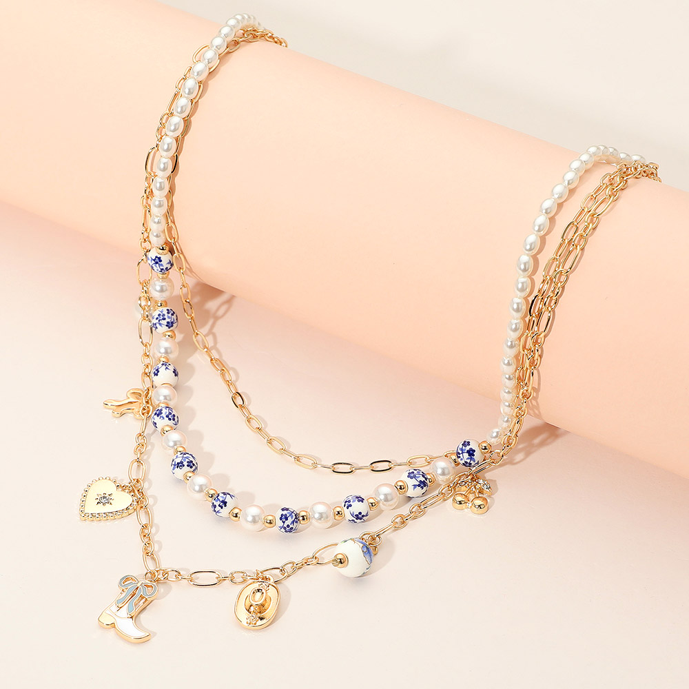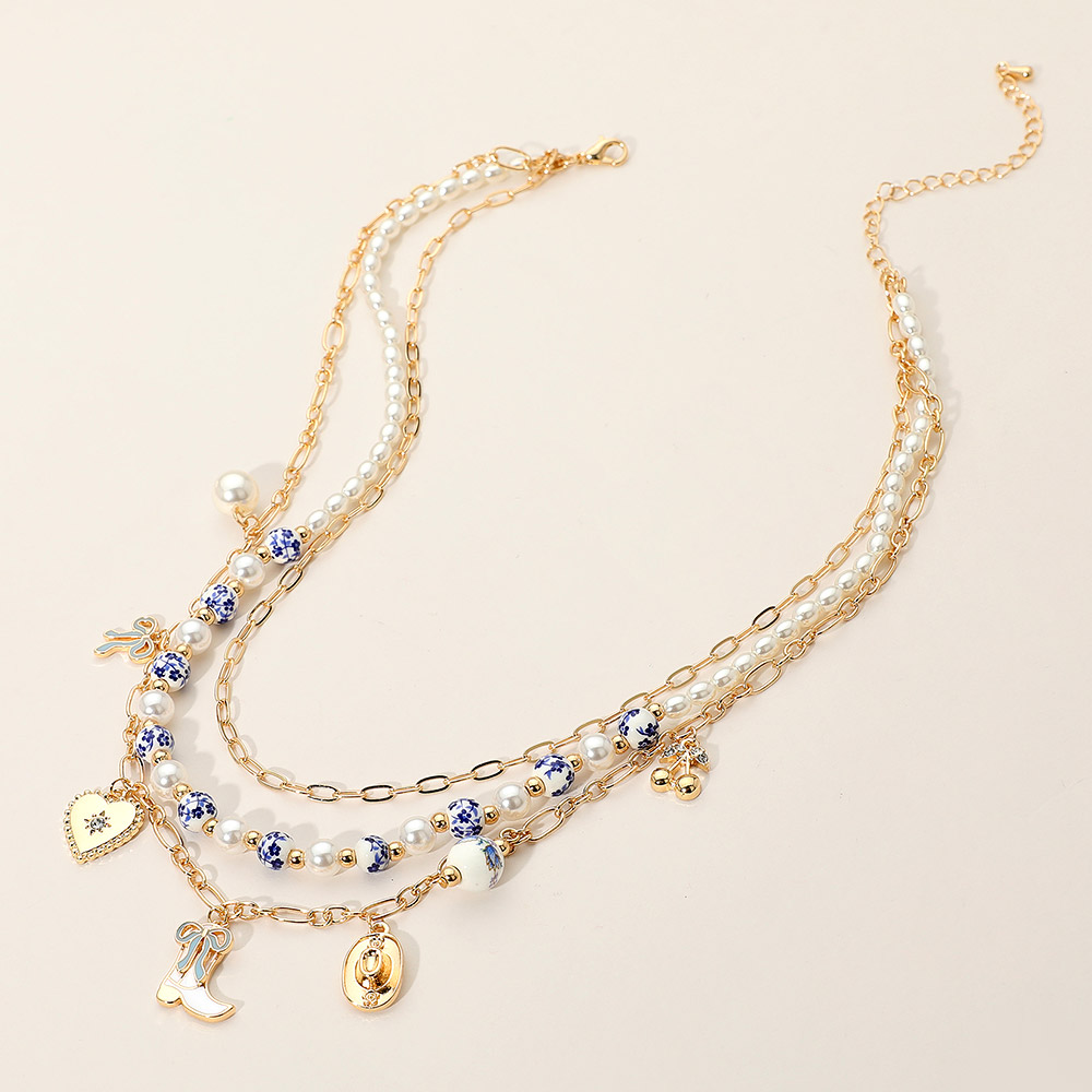 Western Cowboy Boot Hat Bow Cherry Heart Charm Station Pearl Floral Ceramic Ball Beaded Layered Necklace