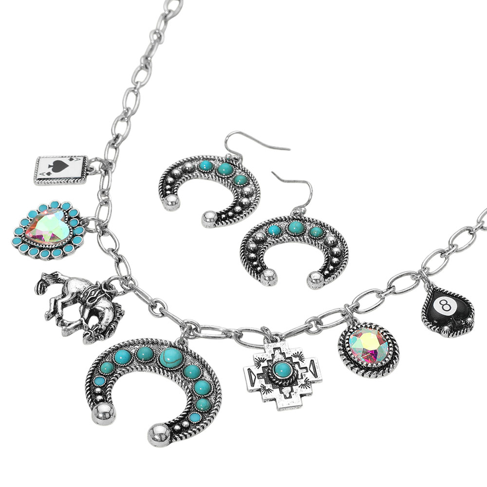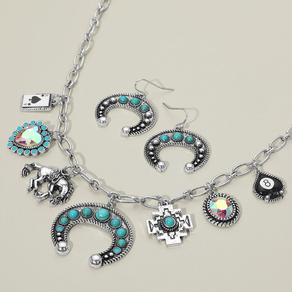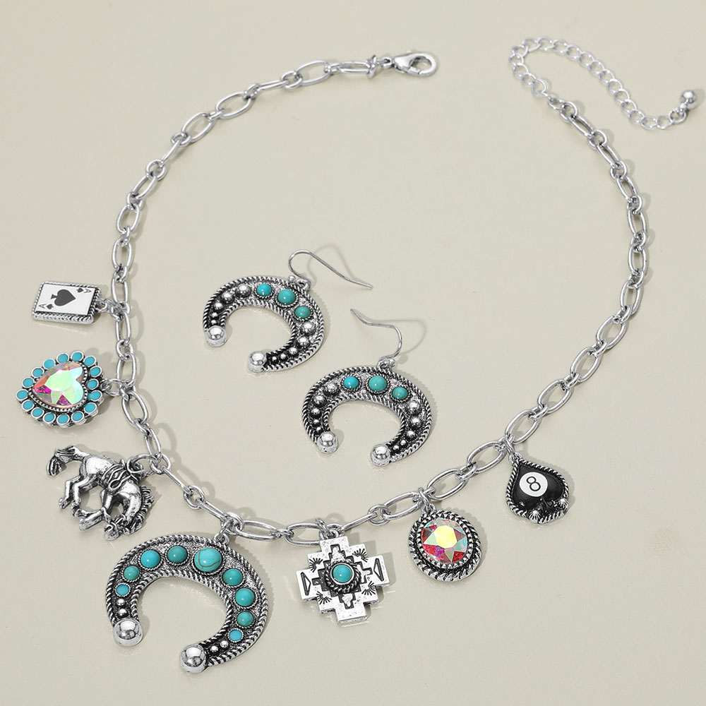 Details • Necklace Size : 16" + 3.5" L • Decor Size : 1.4" L • Earrings Size : 1.4" L • Western-inspired charm necklace with horseshoe, horse, and playing card pendants, paired with matching earrings. Bold design perfect for themed events, statement looks, or everyday cowgirl flair. • Lead and Nickel Compliant
