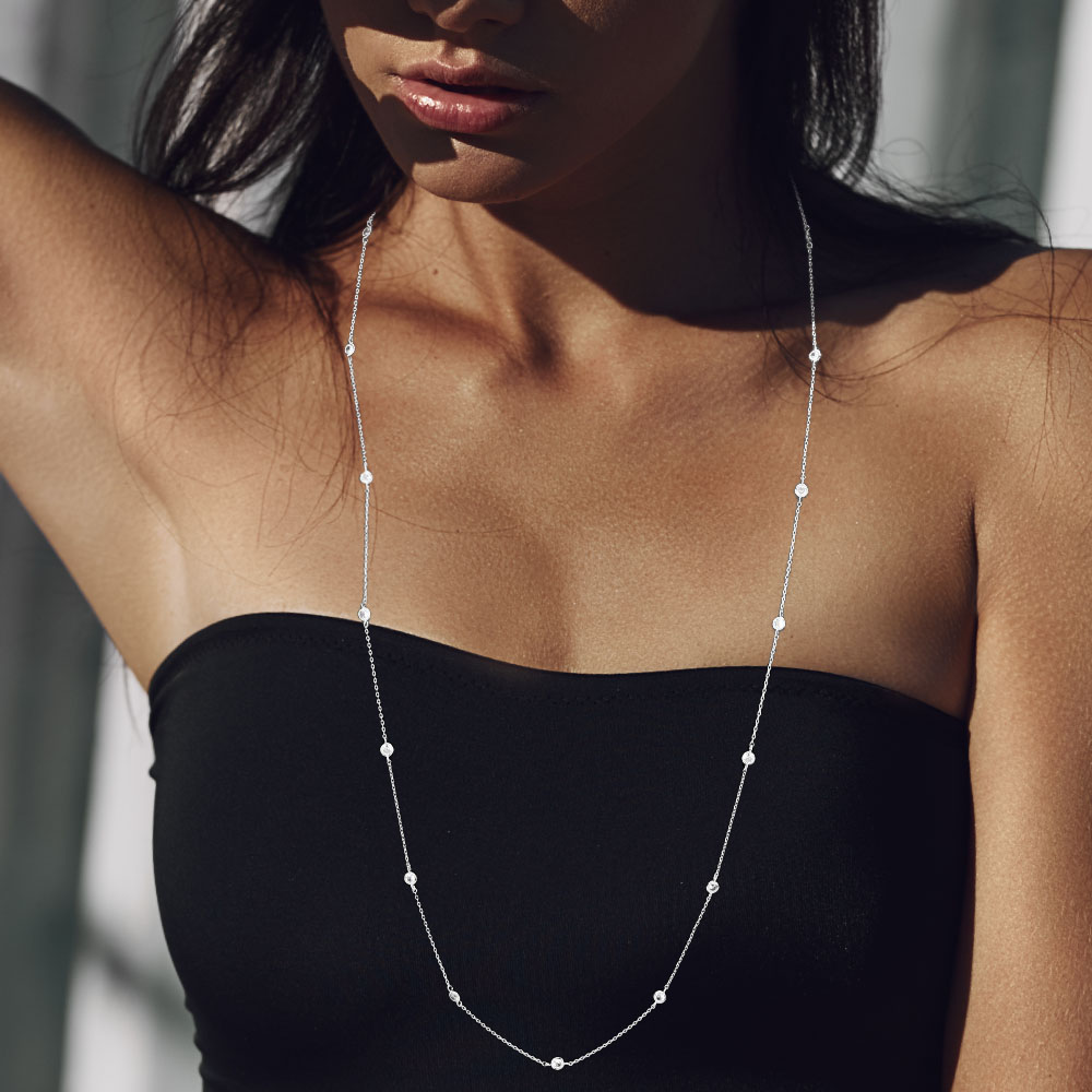 • Delicate long necklace featuring a fine chain adorned with evenly spaced cz crystal accents. A minimalist jewelry piece perfect for layering or wearing alone for understated elegance. Lightweight, versatile, and timeless, this necklace complements both casual outfits and formal ensembles with ease.