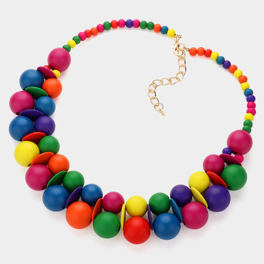 Wood Ball Pointed Wooden Plate Embellished Statement Necklace