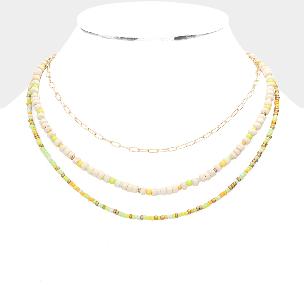 Wood Ball Seed Beaded Triple Layered Bib Necklace