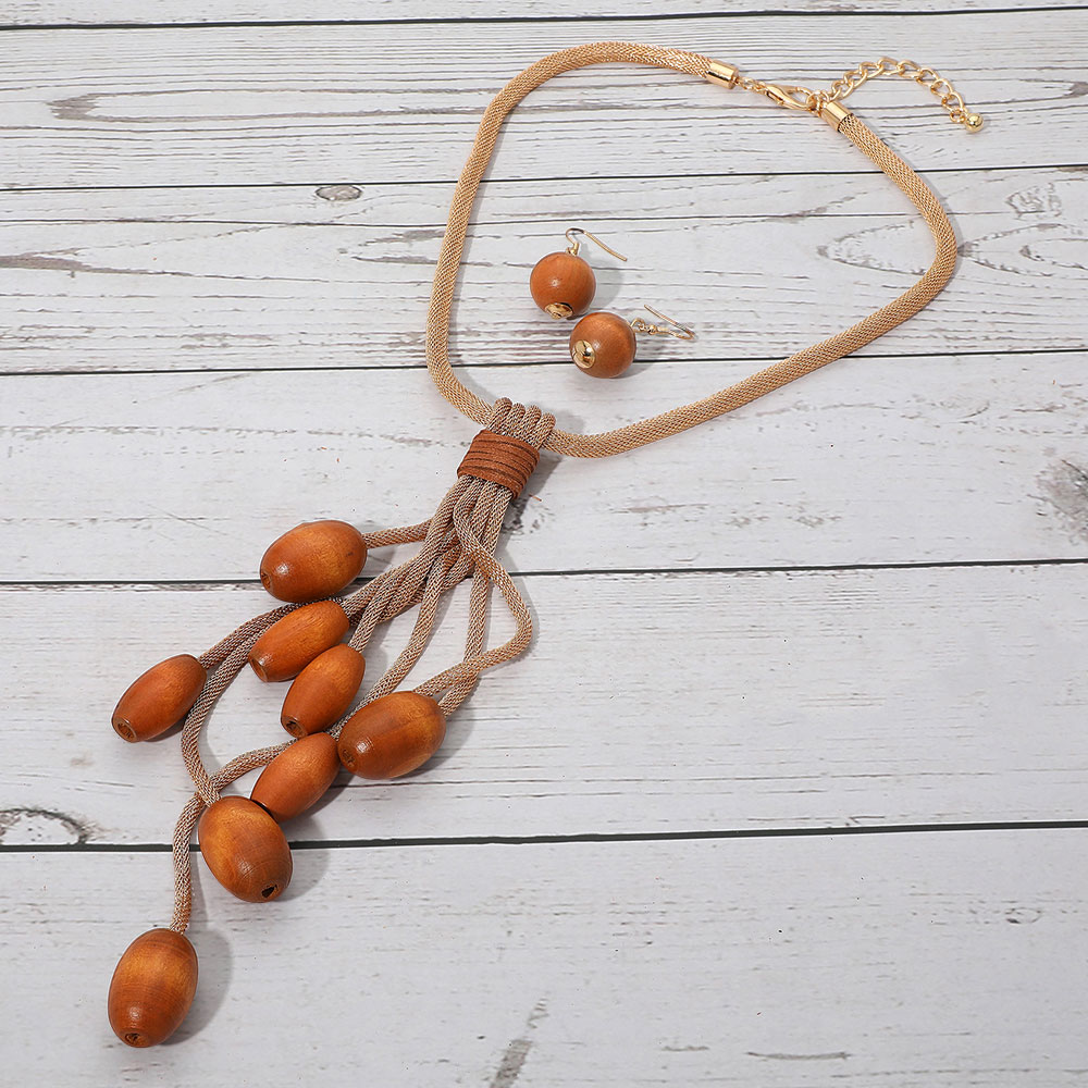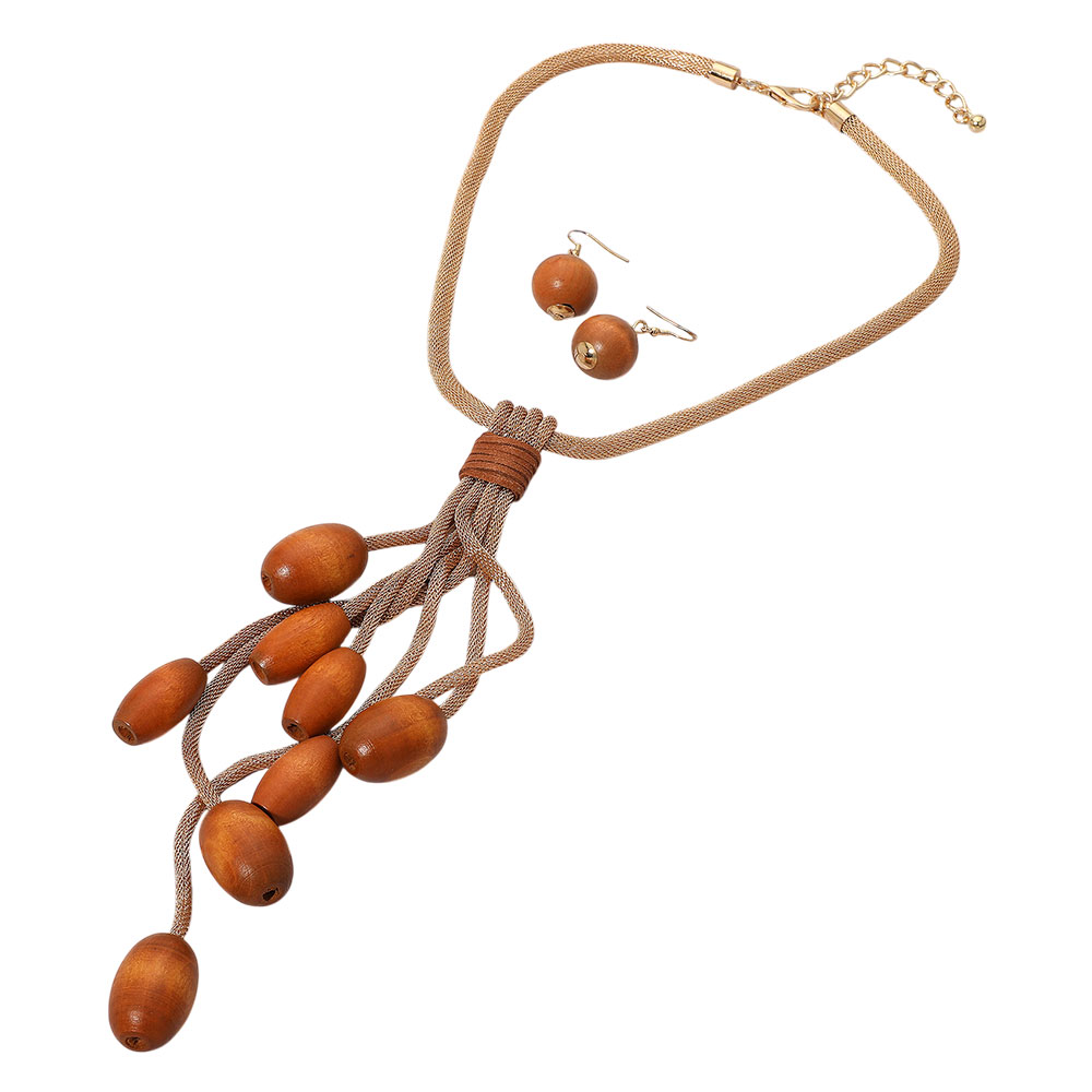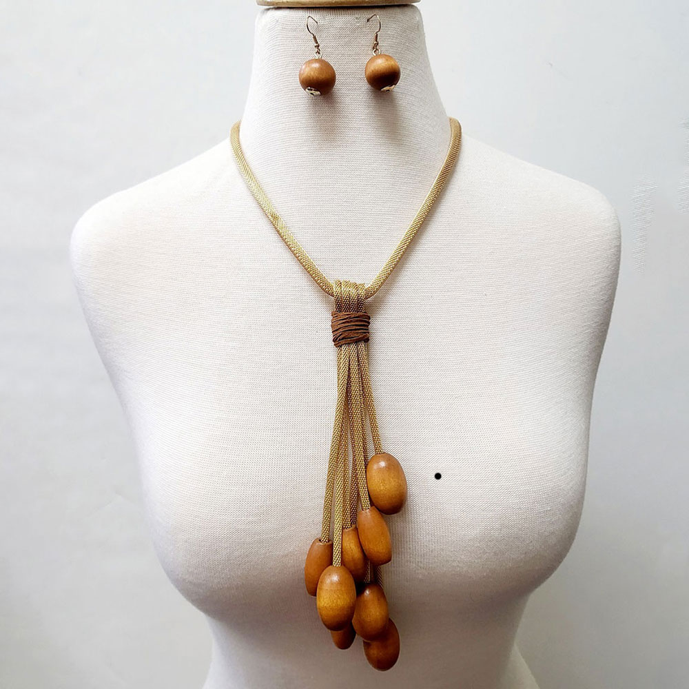 Details • Necklace Size : 21" + 3.25" L • Decor Size : 9.25" L • Earrings Size : 1.6" L • Enhance your natural style with this rustic beaded necklace and matching earrings set. Featuring a soft cord and cascading wooden-like bead tassels, this earthy design adds a unique bohemian charm, perfect for casual outfits or festival-inspired looks. • Lead and Nickel Compliant