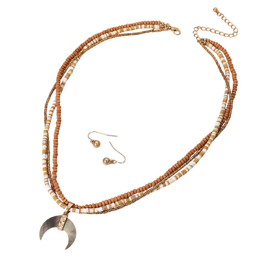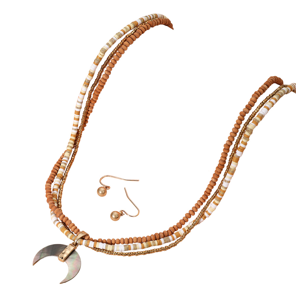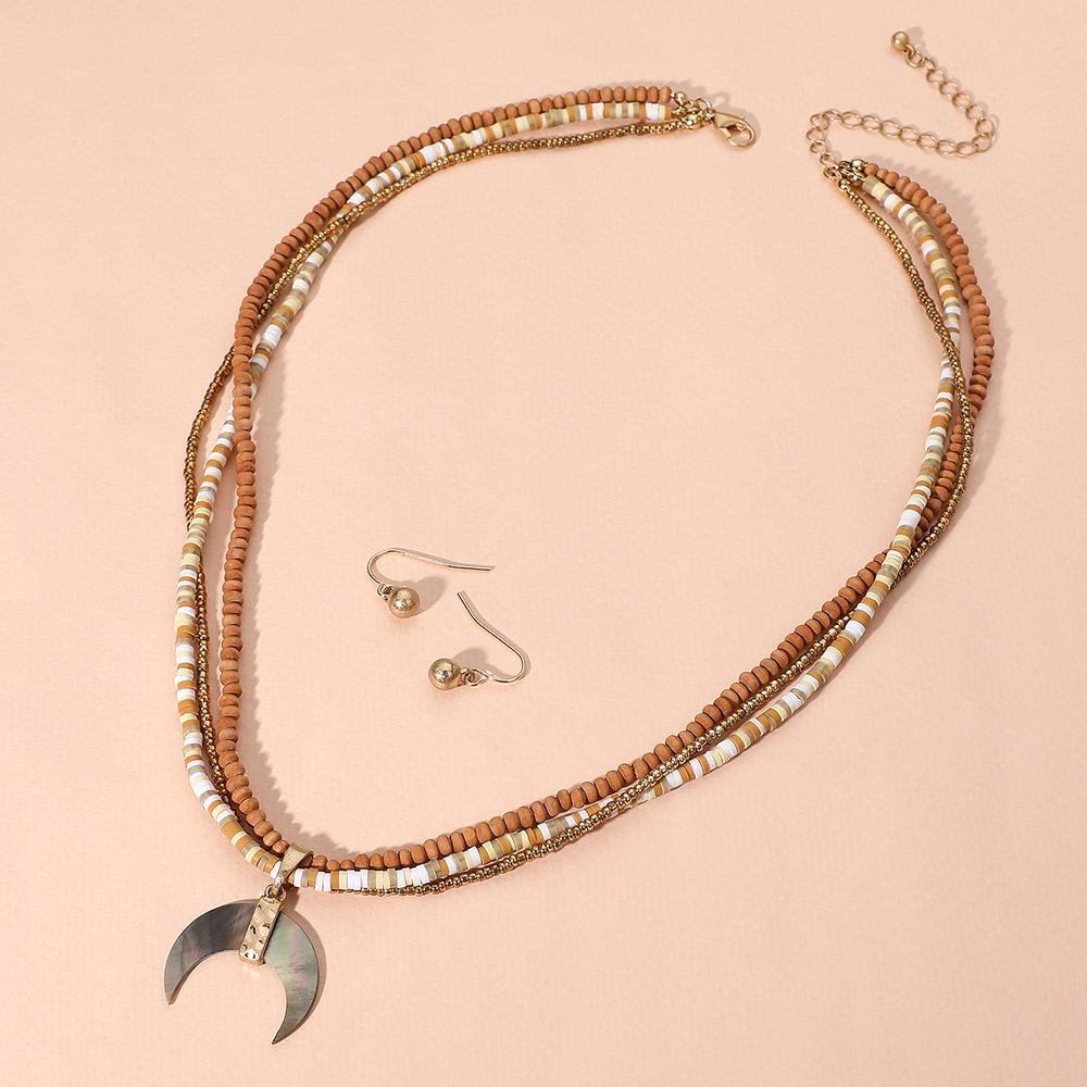 • Stylish layered beaded necklace featuring a crescent pendant, paired with coordinating drop earrings. A bohemian-inspired jewelry set perfect for adding unique charm to casual looks, gifting, or layering with other accessories.