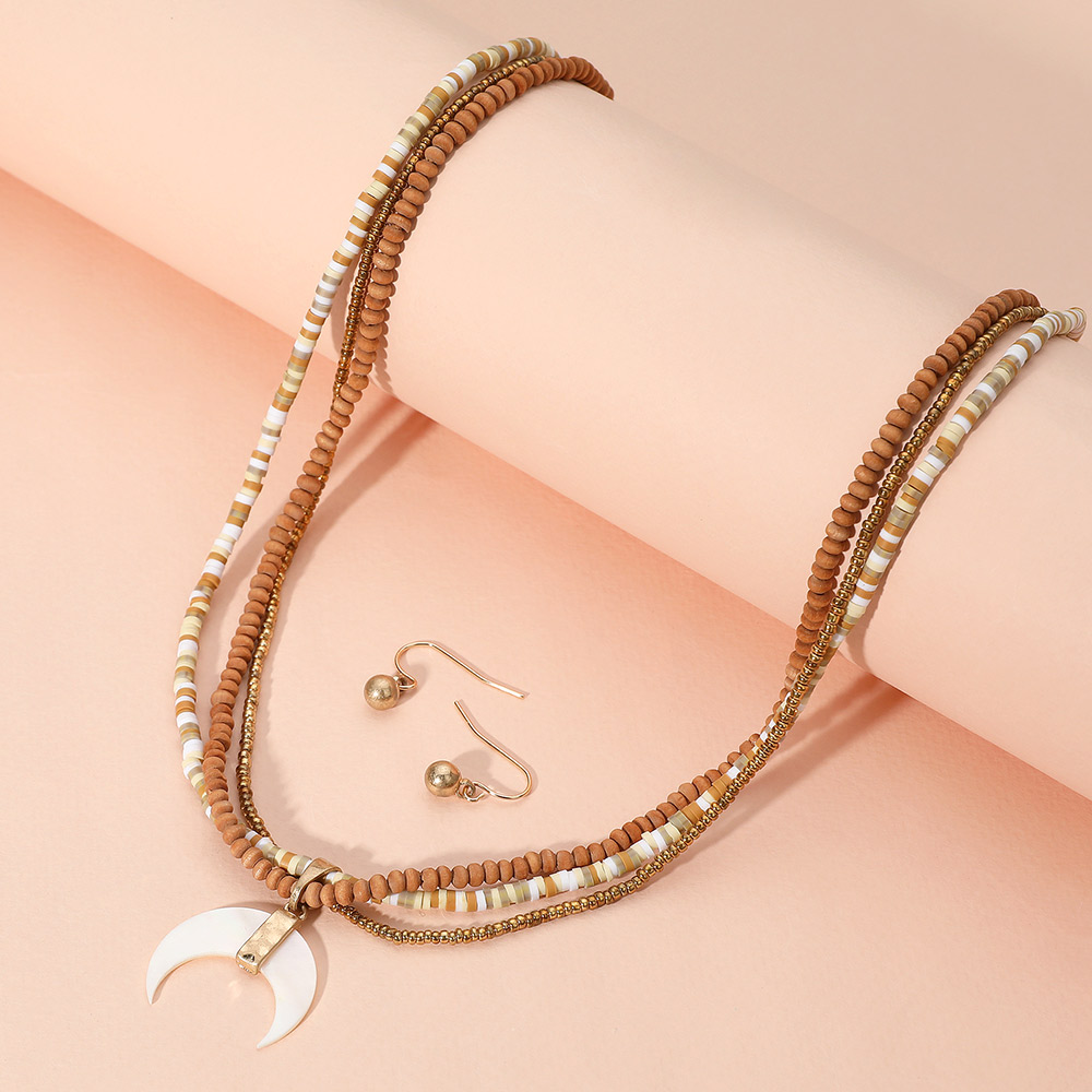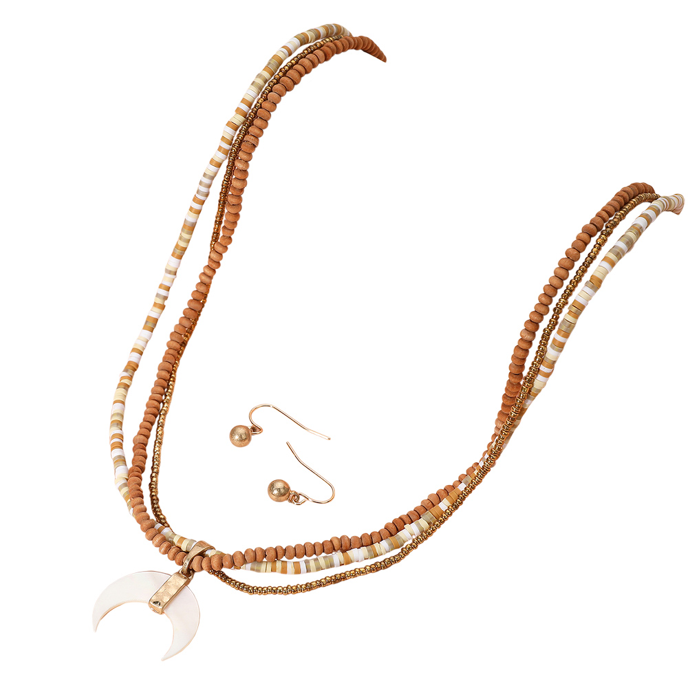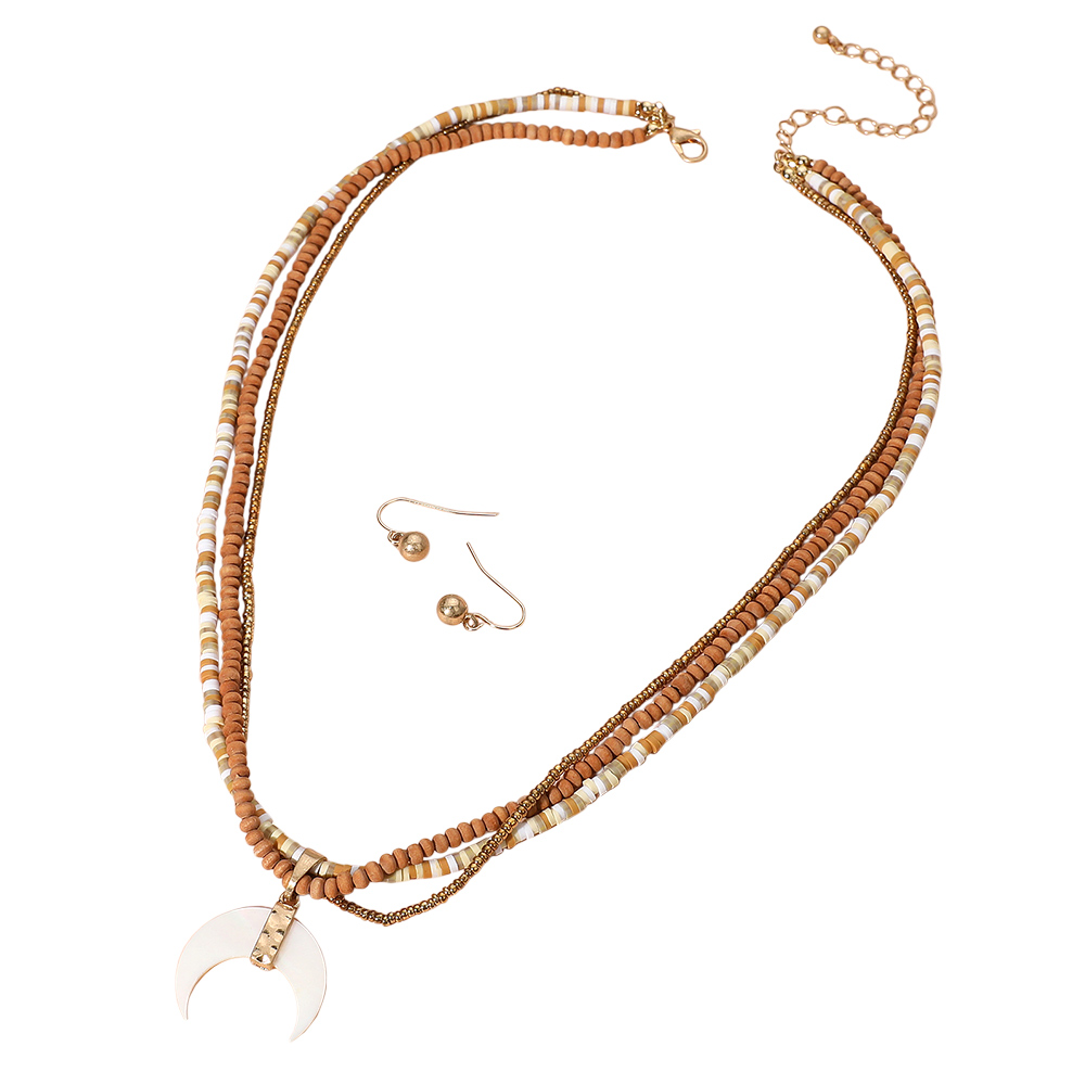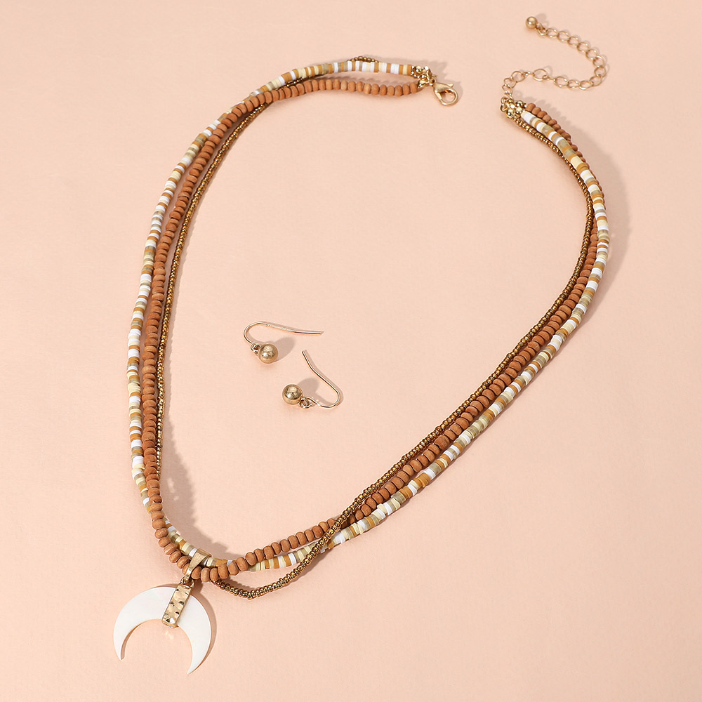 Details • Necklace Size : 19" L + 3" L • Pendant Size : 1" X 1.25" • Earring Size : 0.6" L • Stylish layered beaded necklace featuring a crescent pendant, paired with coordinating drop earrings. A bohemian-inspired jewelry set perfect for adding unique charm to casual looks, gifting, or layering with other accessories. • Lead and Nickel Compliant