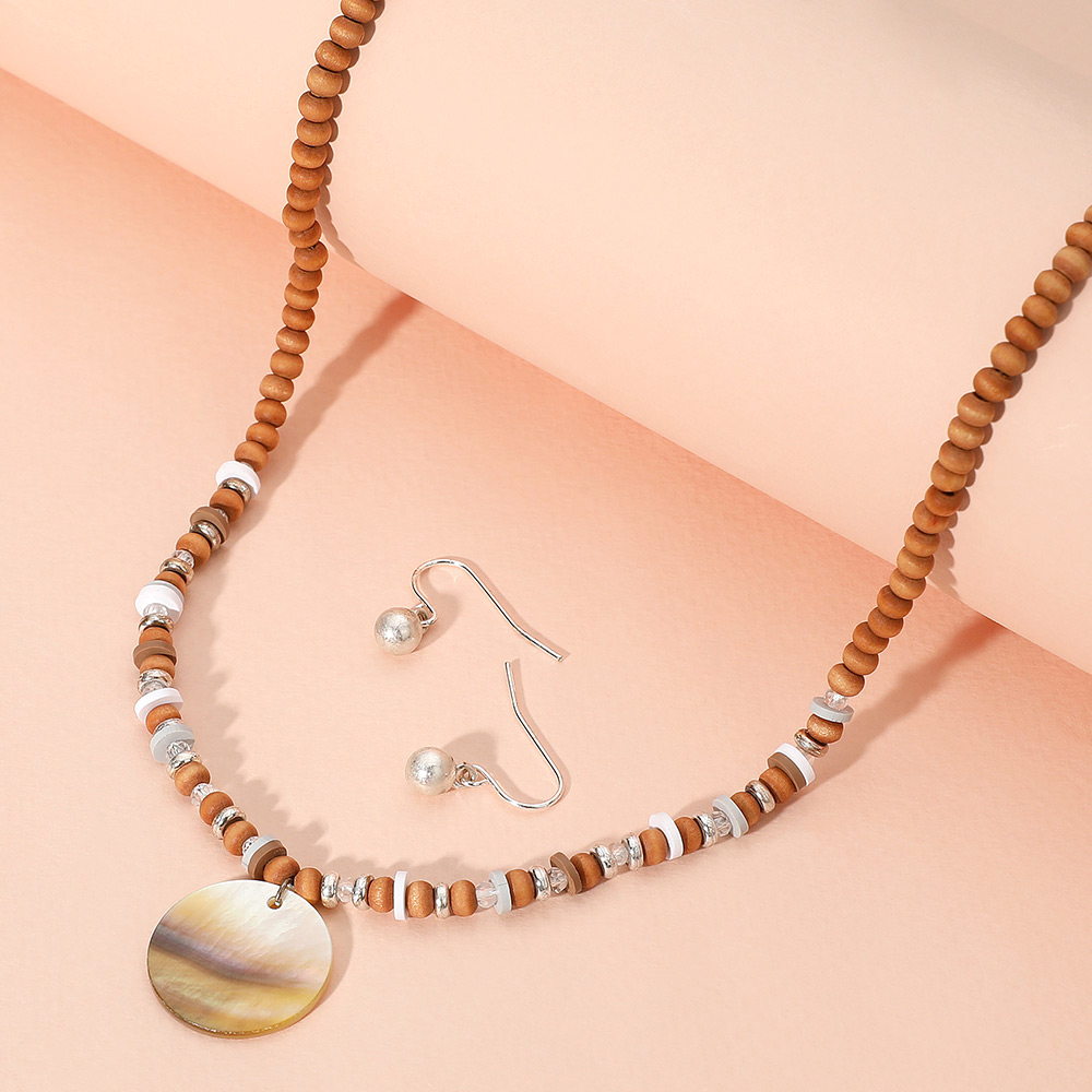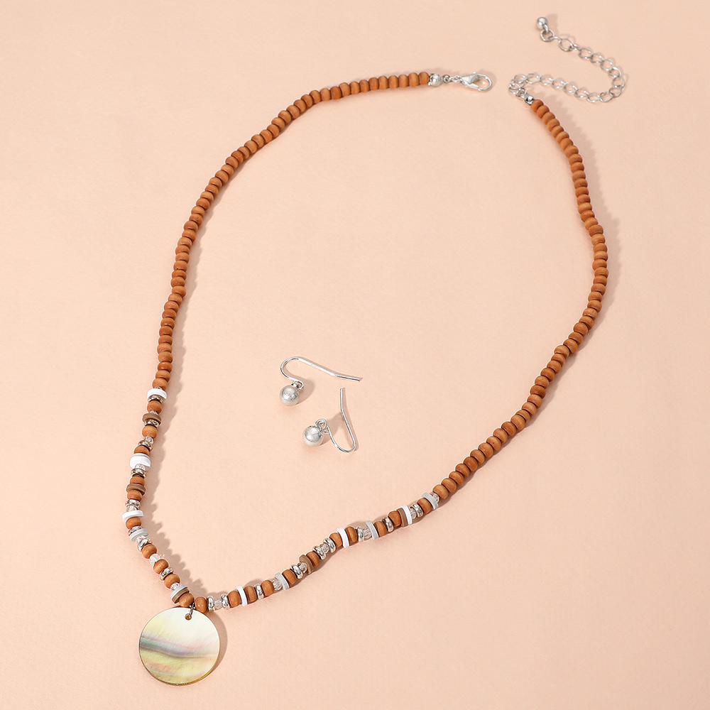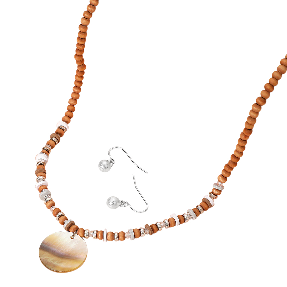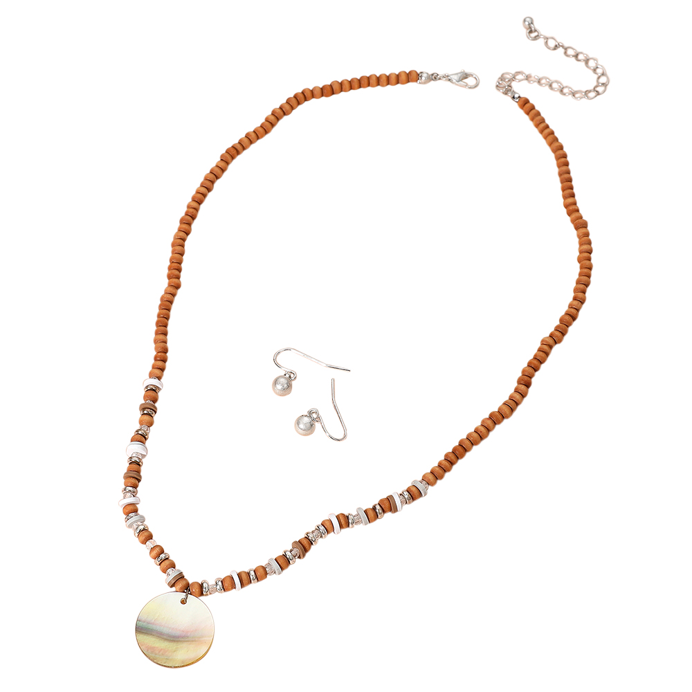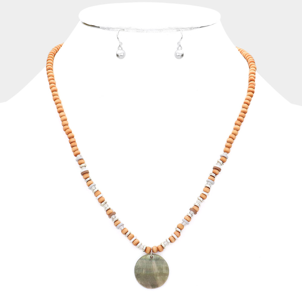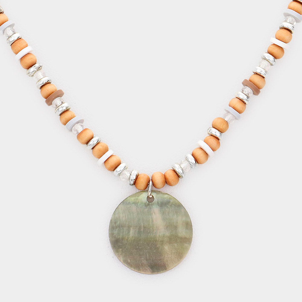 Wood Heishi Beaded Mother Of Pearl Pendant Necklace