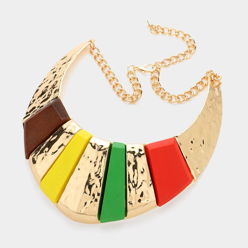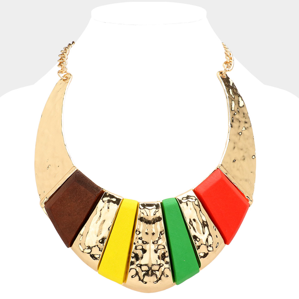 Wood Pointed Hammered Metal Curved Bib Necklace