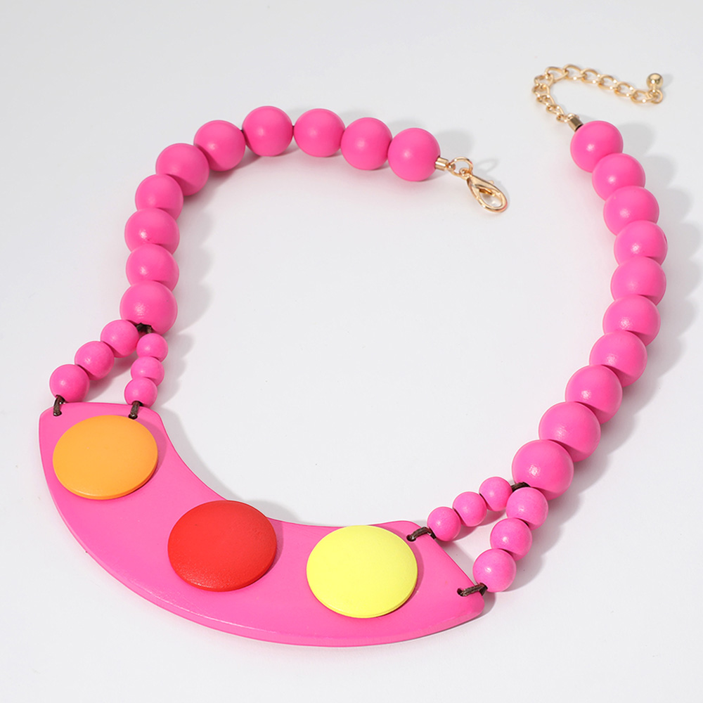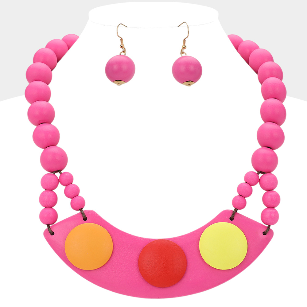 Rainbow Round Wood Metal Disc Cluster Statement Necklace