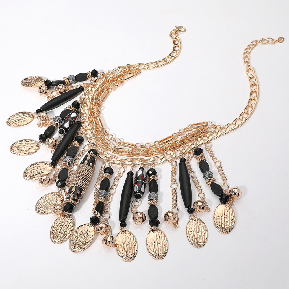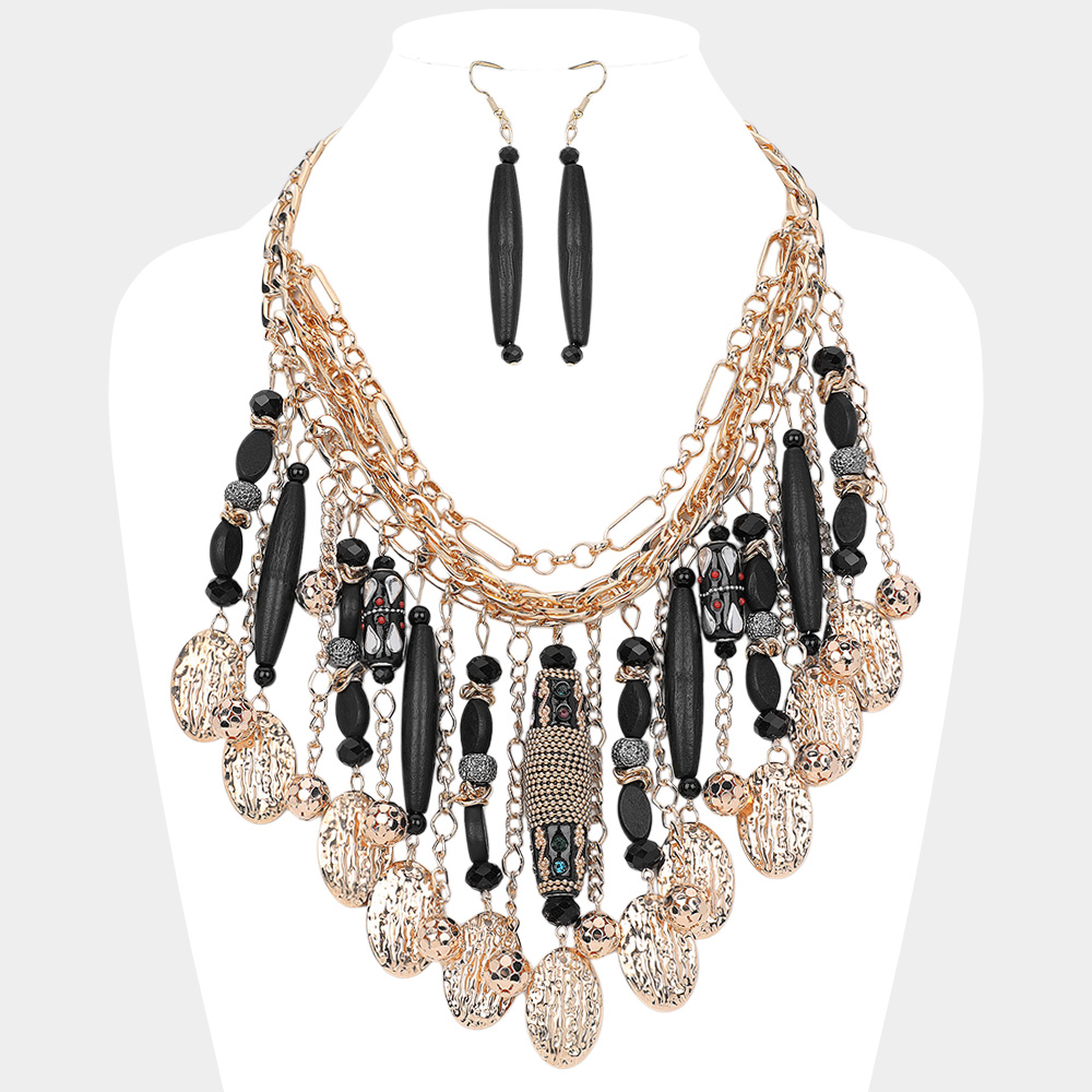 Wooden Stone Embellished Cylinder Textured Metal Oval Tip Station Collar Statement Necklace