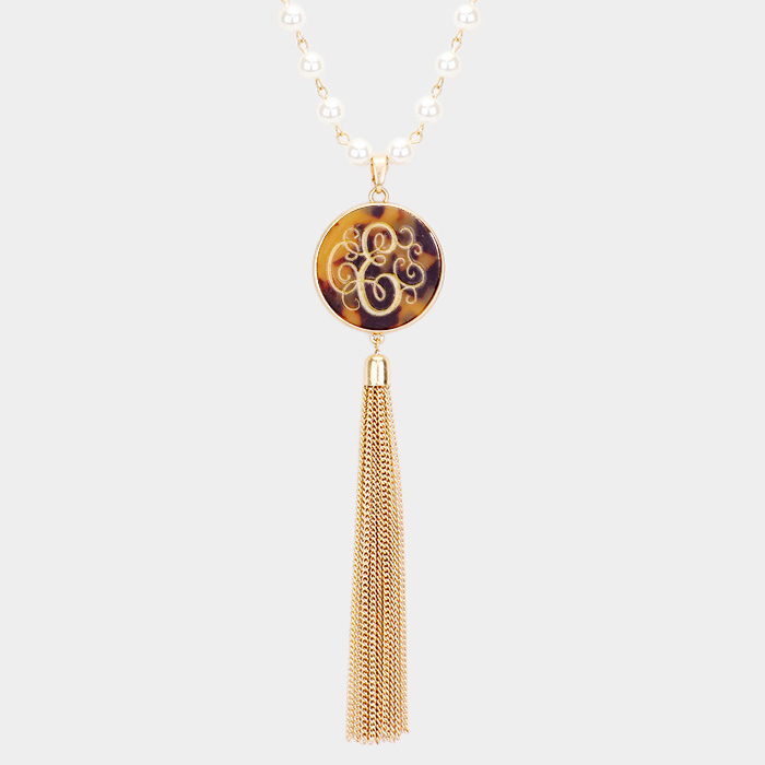 -E- Initial Monogram Pearl Metal Tassel Necklace