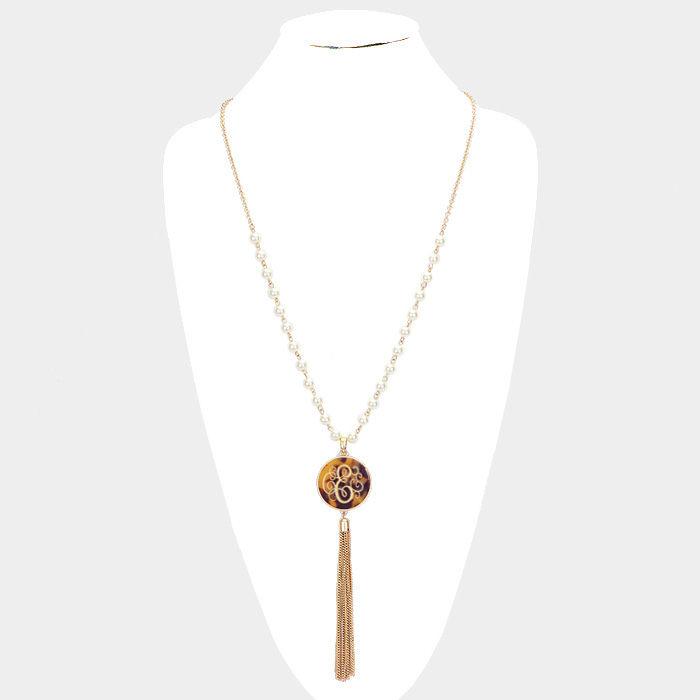 -N- Initial Monogram Pearl Metal Tassel Necklace