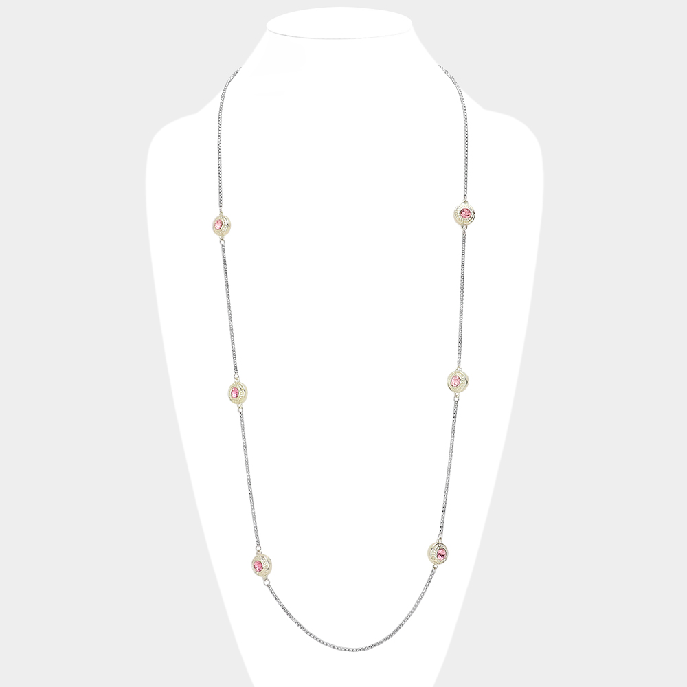 14K Gold Plated Two Tone Stone Paved Circle Pendant Station Long Necklace