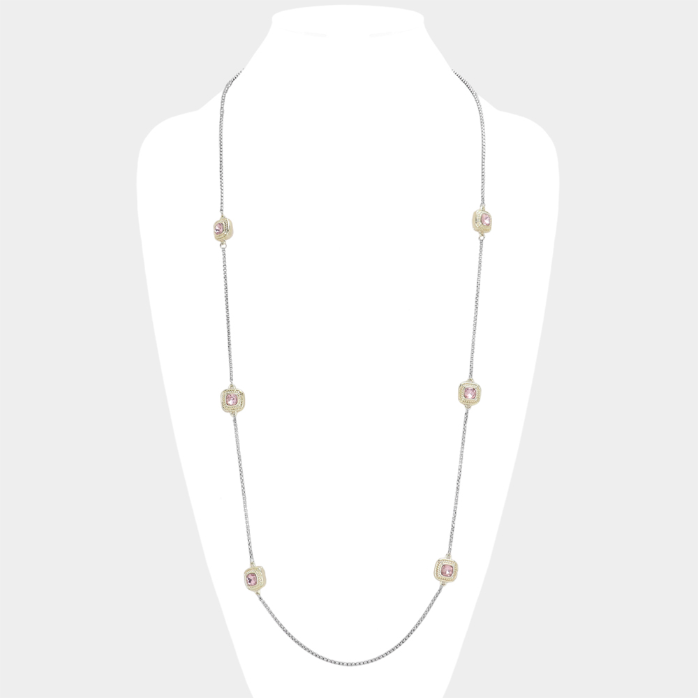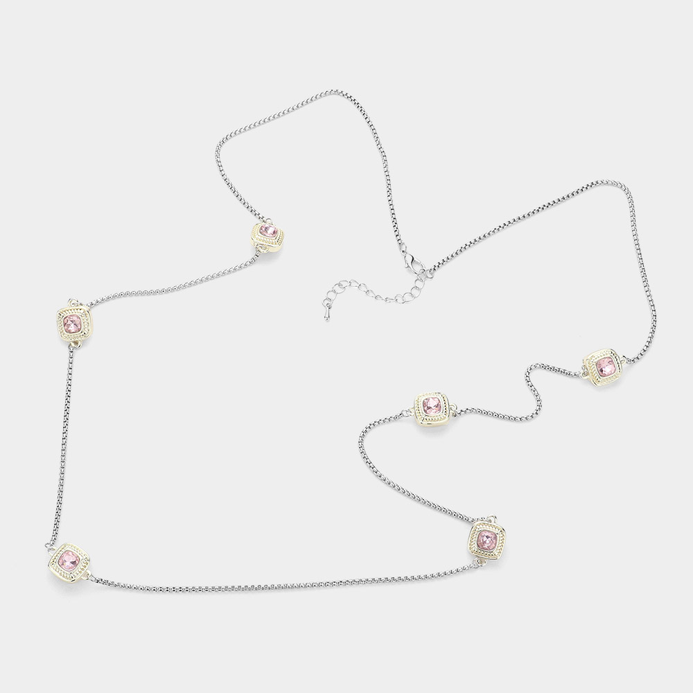 14K Gold Plated Two Tone Stone Paved Square Pendant Station Long Necklace