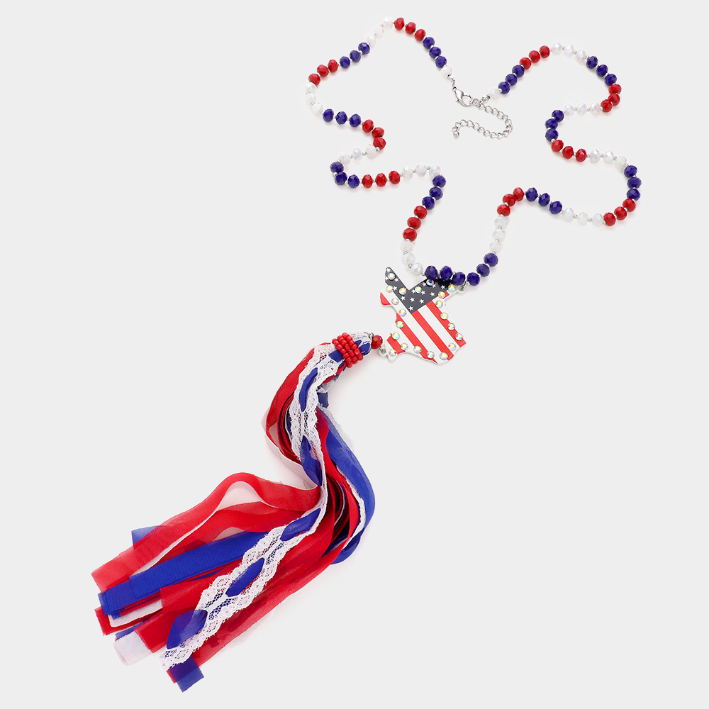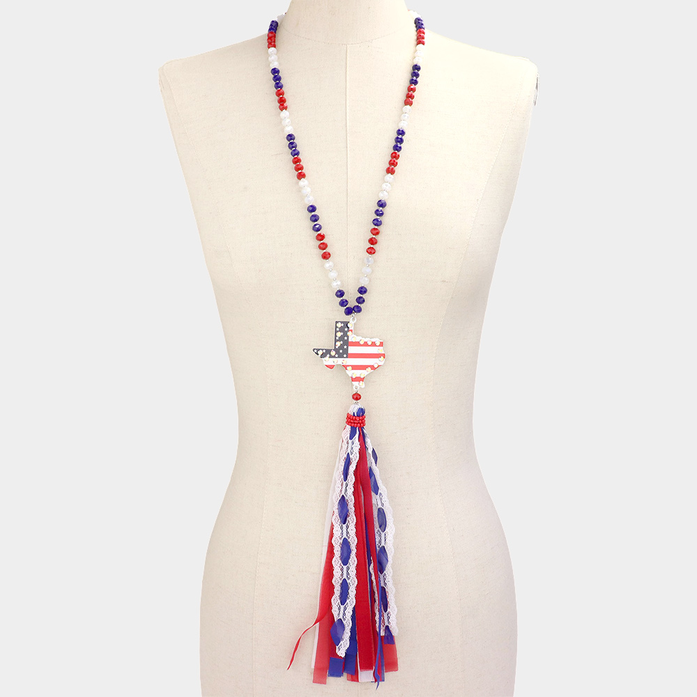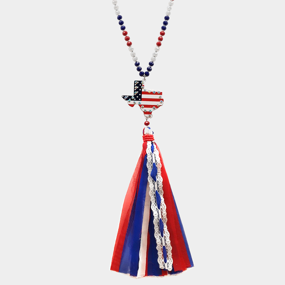 American USA Flag Texas State Map Mesh Fabric Tassel Link Long Necklace
