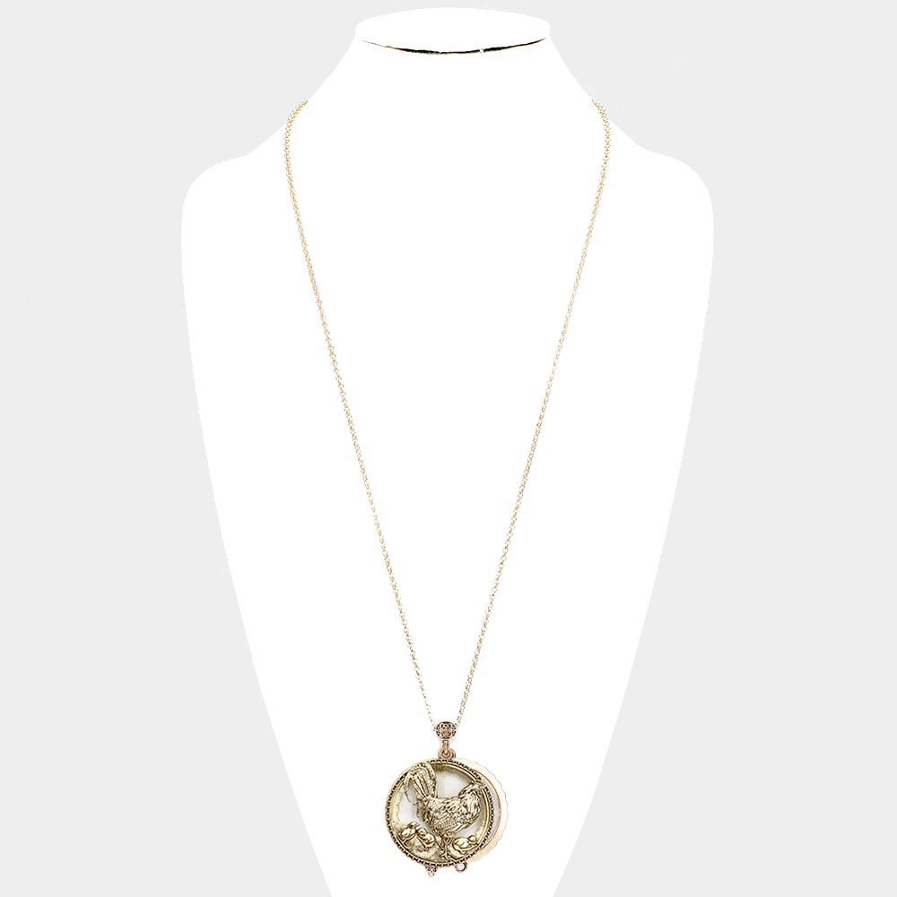 Antique Metal Rooster Magnifying Glass Pendant Long Necklace