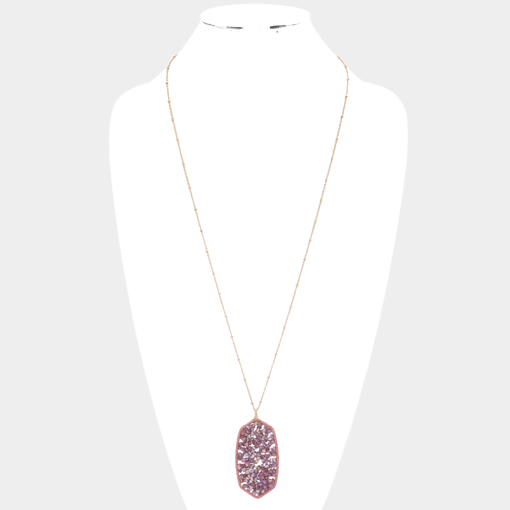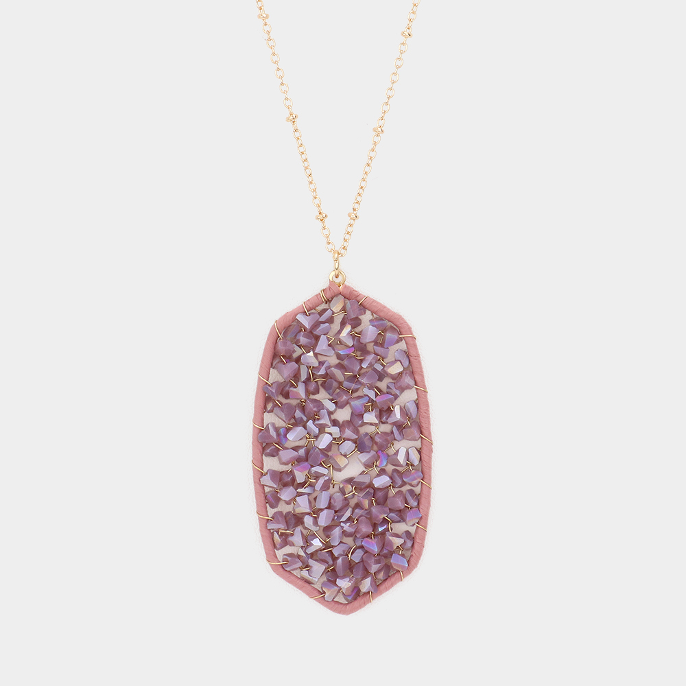 Beaded Raffia Wrapped Hexagon Pendant Long Necklace