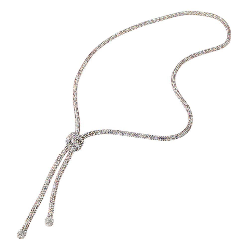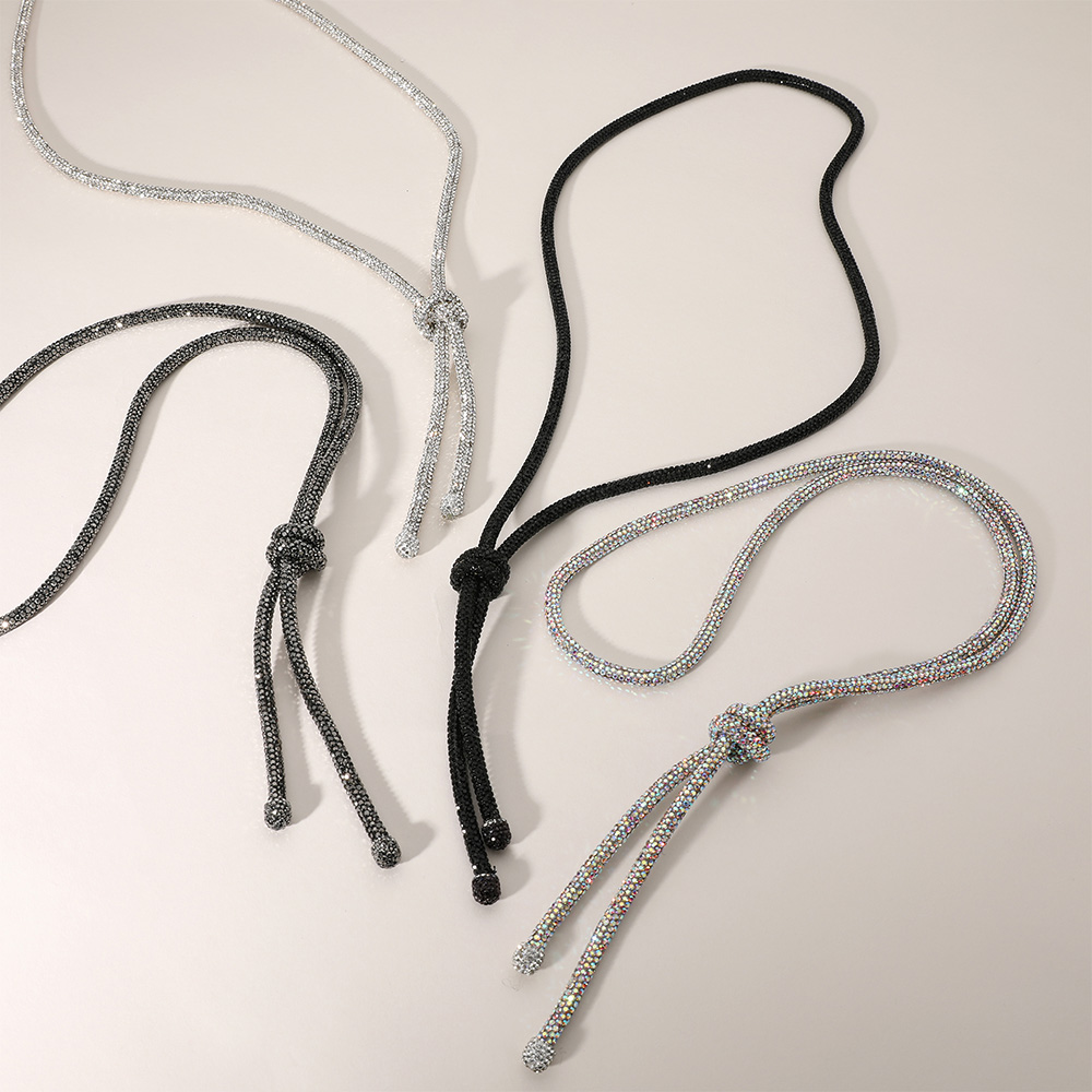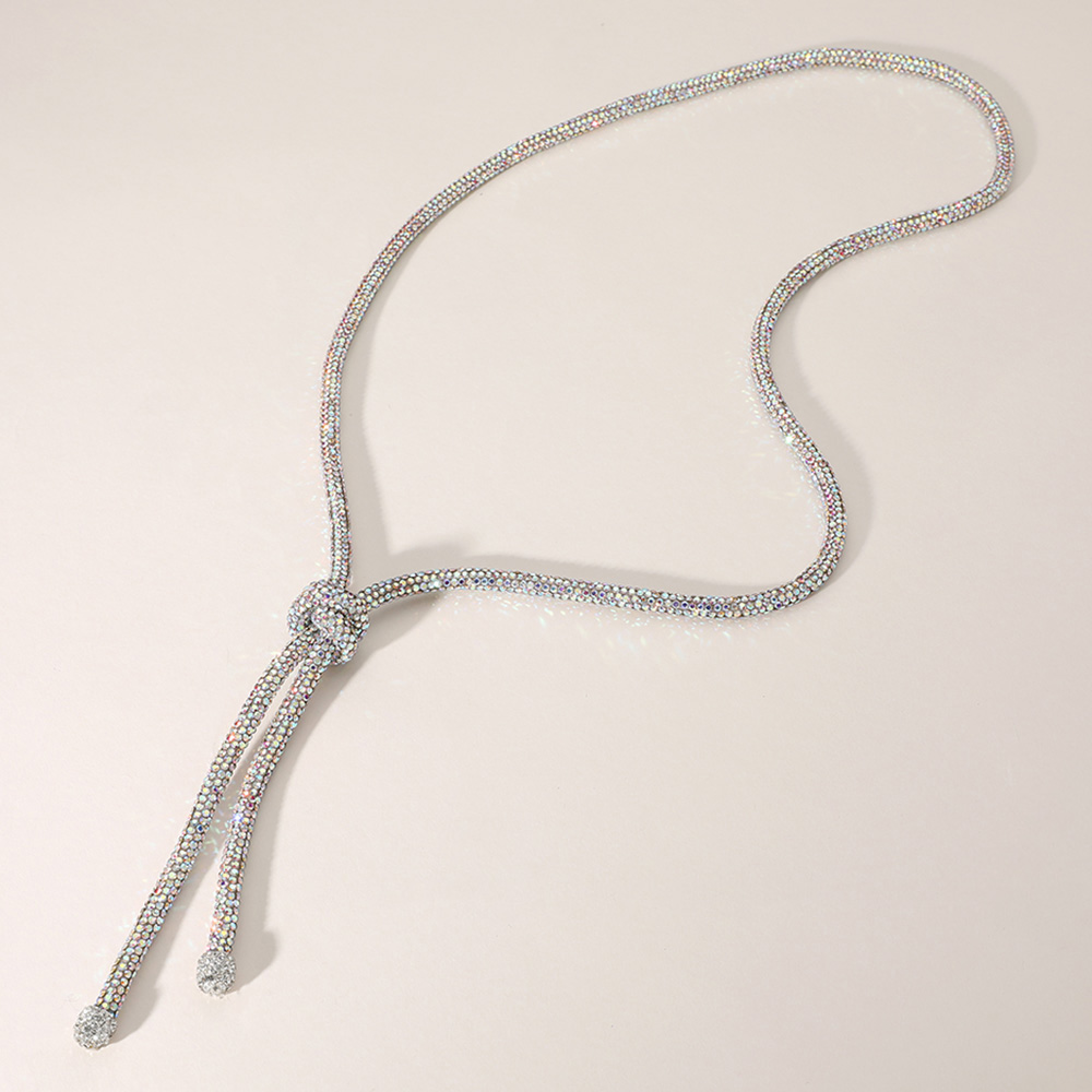 Details • Necklace Size : 40" L • This elegant bling studded lariat chain necklace features a sleek knotted design that drapes beautifully for a modern, sophisticated look. Perfect for both casual and formal settings, its adjustable length and minimalist charm make it a versatile addition to any jewelry collection. • Lead and Nickel Compliant • Made In Korea