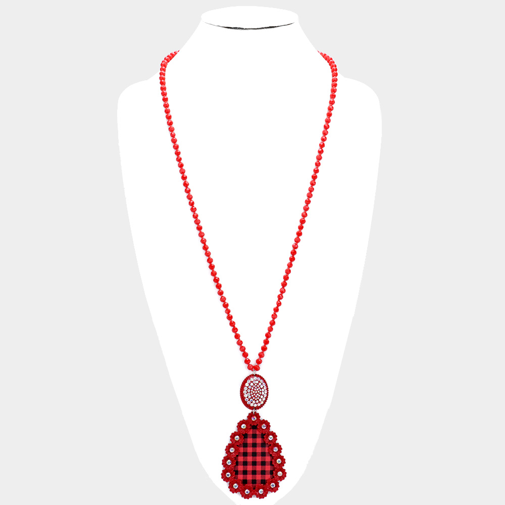 Buffalo Check Plaid Flower Rhinestone Pendant Long Necklace