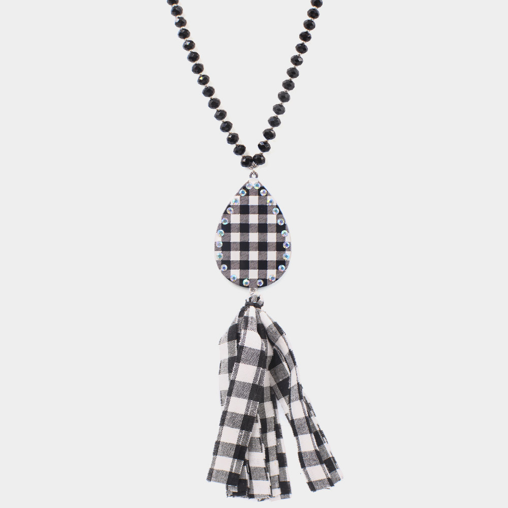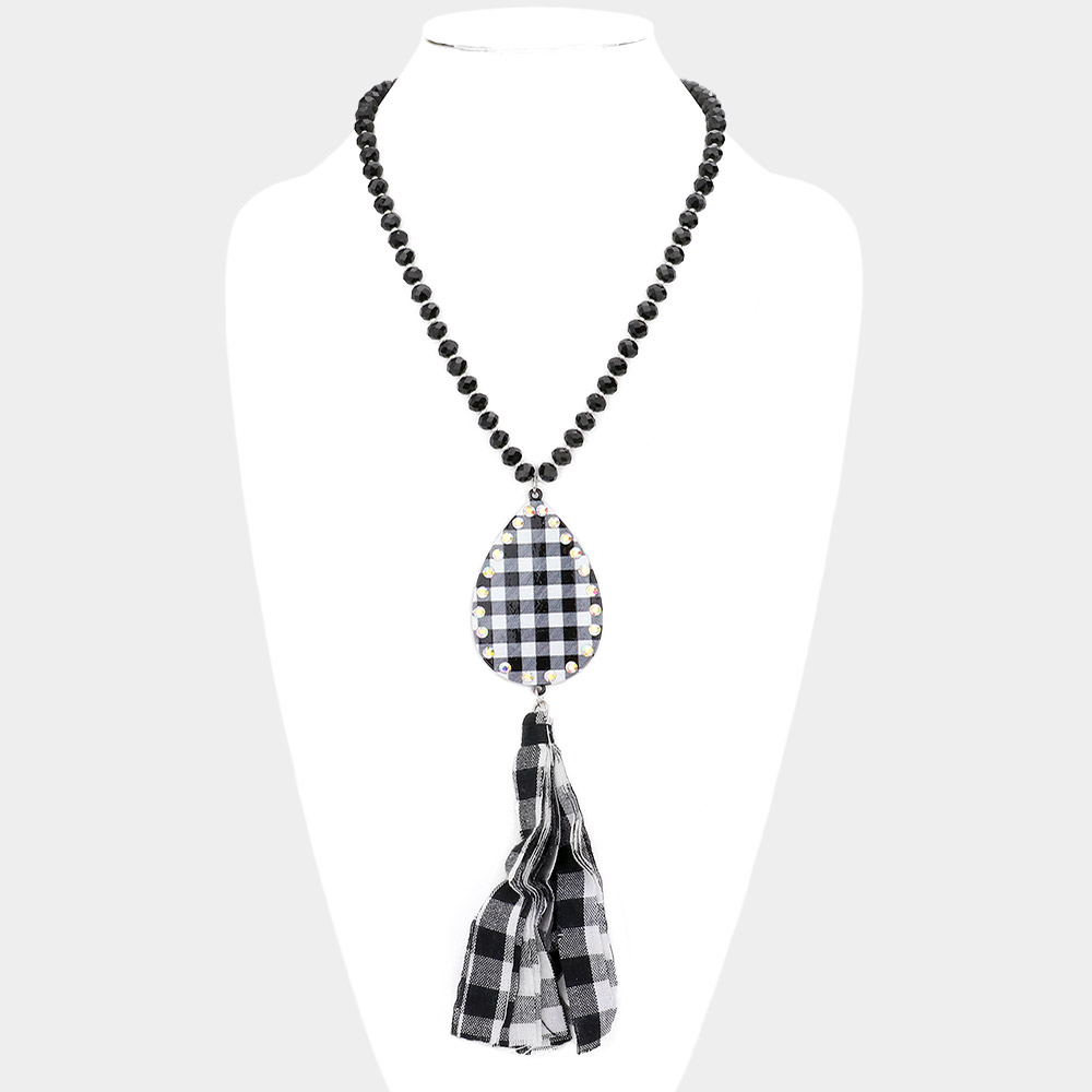 Buffalo Plaid Teardrop Metal Fabric Tassel Dangle Pendant Long Necklace