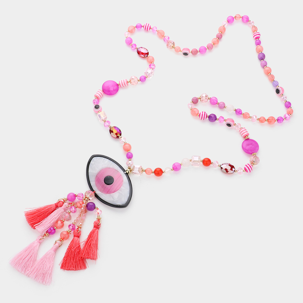 Celluloid Acetate Evil Eye Accented Tassel Beaded Long Necklace
