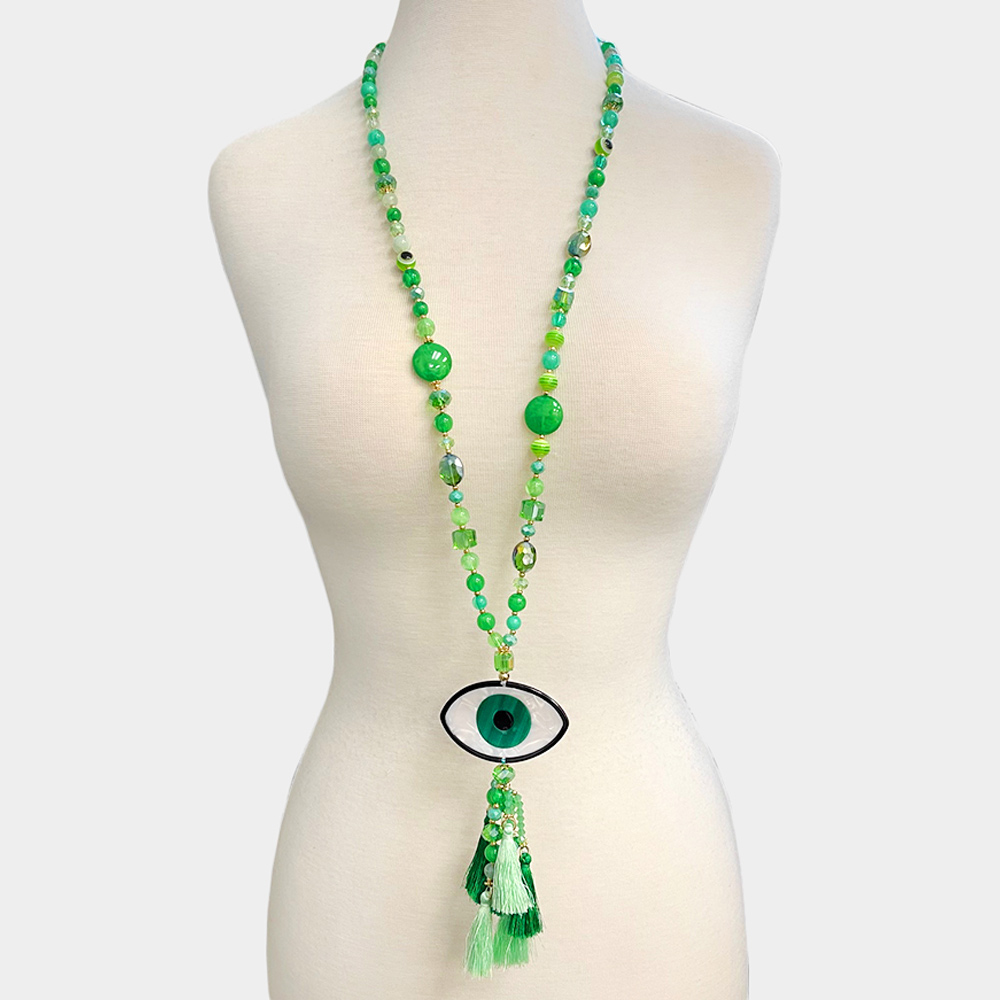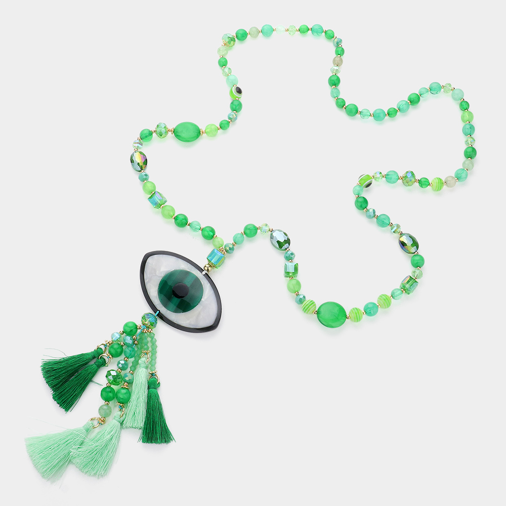 Celluloid Acetate Evil Eye Accented Tassel Beaded Long Necklace